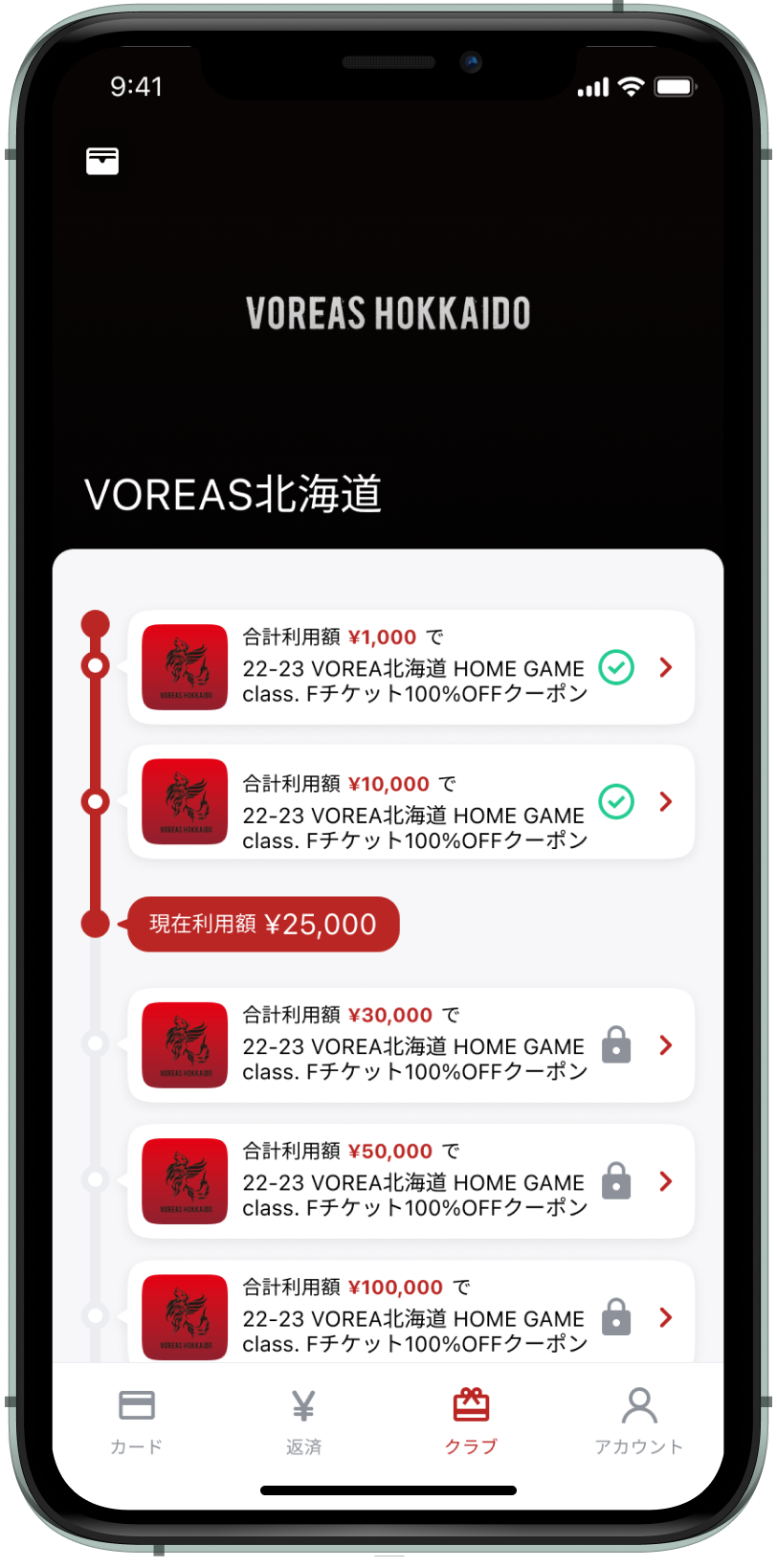 「ヴォレアス北海道」クラブではカード利用額に応じて、豪華な特典がもらえます。