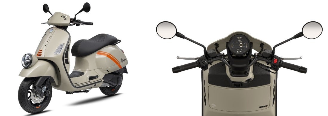 新型ベスパGTVは、サイドパネルを斜めに走る、コントラストの効いたオレンジのグラフィックを施した艶ありのサッビアベージュの専用カラーをラインアップしています。