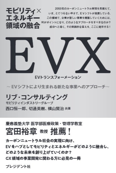 モビリティ領域に強みを持ち、ベンチャー・中堅企業の経営コンサルティングから、大企業の事業開発領域支援を行う株式会社リブ・コンサルティング(所在地:東京都千代田区、代表取締役:関厳)はGX・EV領域における事業開発コンサルティングプロジェクトを通して得た独自の知見を基に、EVを起点としたモビリティ×エネルギー領域の融合から生まれる新ビジネスの勝ち筋を探る提言をまとめた書籍『EVX(EVトランスフォーメーション)』を、2022年12月20日(火)、プレジデント社より全国書店にて発売いたします。