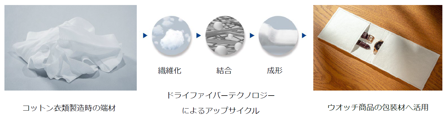セイコーエプソン株式会社(以下 エプソン)は、循環型経済の実現を目指して、エプソン独自のドライファイバーテクノロジーを応用し、コットン衣類の縫製過程で発生する端材を原料としてアップサイクルした新たな包装材を実用化しました。この包装材は2022年内にエプソンが販売する一部のウオッチ商品から採用していきます。