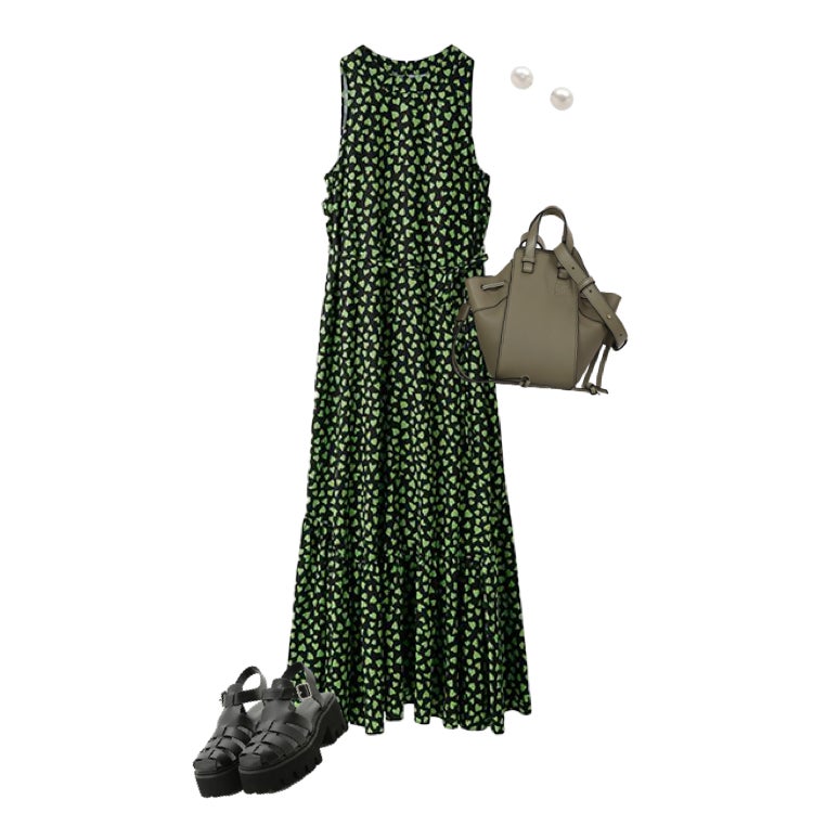 カーキの「ハンモックドローストリングミニ」を主役に、秋らしいブラックベースにグリーンの柄ワンピースを合わせた、大人可愛いコーディネートです。足元にはブラックの厚底グルカサンダルを合わせ、トレンド感をプラスしました。ワンピースの柄とバッグの色味がリンクし、全体にまとまりのある印象を与えます。9月に入り、まだ暑さが残る日にもぴったりな、軽やかさと秋らしさを兼ね備えたスタイリングです。パールのアクセサリーを添えると上品なアクセントになります。