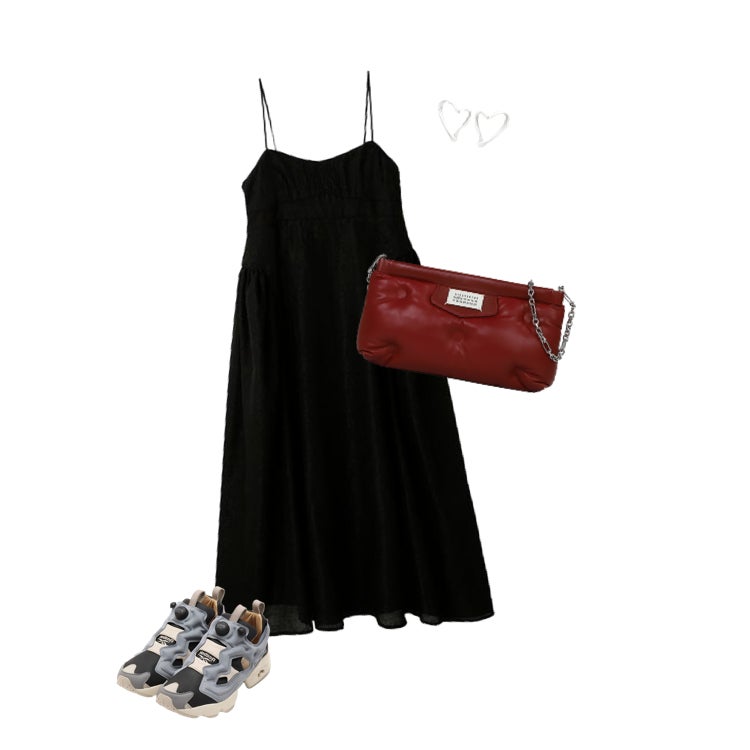 シックな黒のキャミソールワンピースに、鮮やかなボルドーの「グラムスラム」を合わせた、大人のエッジが効いたスタイルです。シンプルながらも、ふっくらとしたフォルムとチェーンの輝きが、コーディネート全体に華やかさと奥行きを与えてくれます。足元にはボリューム感のあるスニーカーを合わせ、軽快なストリート感をプラスしました。耳元にはシンプルなハート型のピアスで可愛らしさを添え、バッグのボルドーカラーで秋らしさを先取りしています。季節の変わり目にぴったりな、甘辛ミックスの着こなしです。