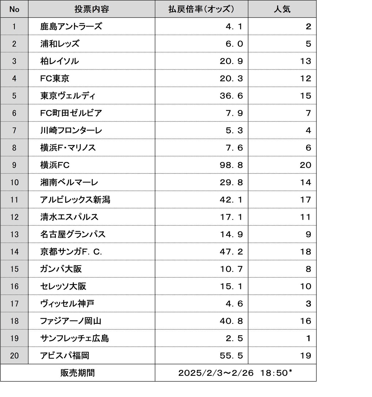 1番人気は、昨シーズン2位のサンフレッチェ広島で、払戻倍率(オッズ)は2.5倍!2番人気は、昨シーズン5位の鹿島アントラーズで、払戻倍率(オッズ)は4.1倍、3番人気は、明治安田J1リーグ3連覇を目指すヴィッセル神戸で、払戻倍率(オッズ)は4.6倍となっています。