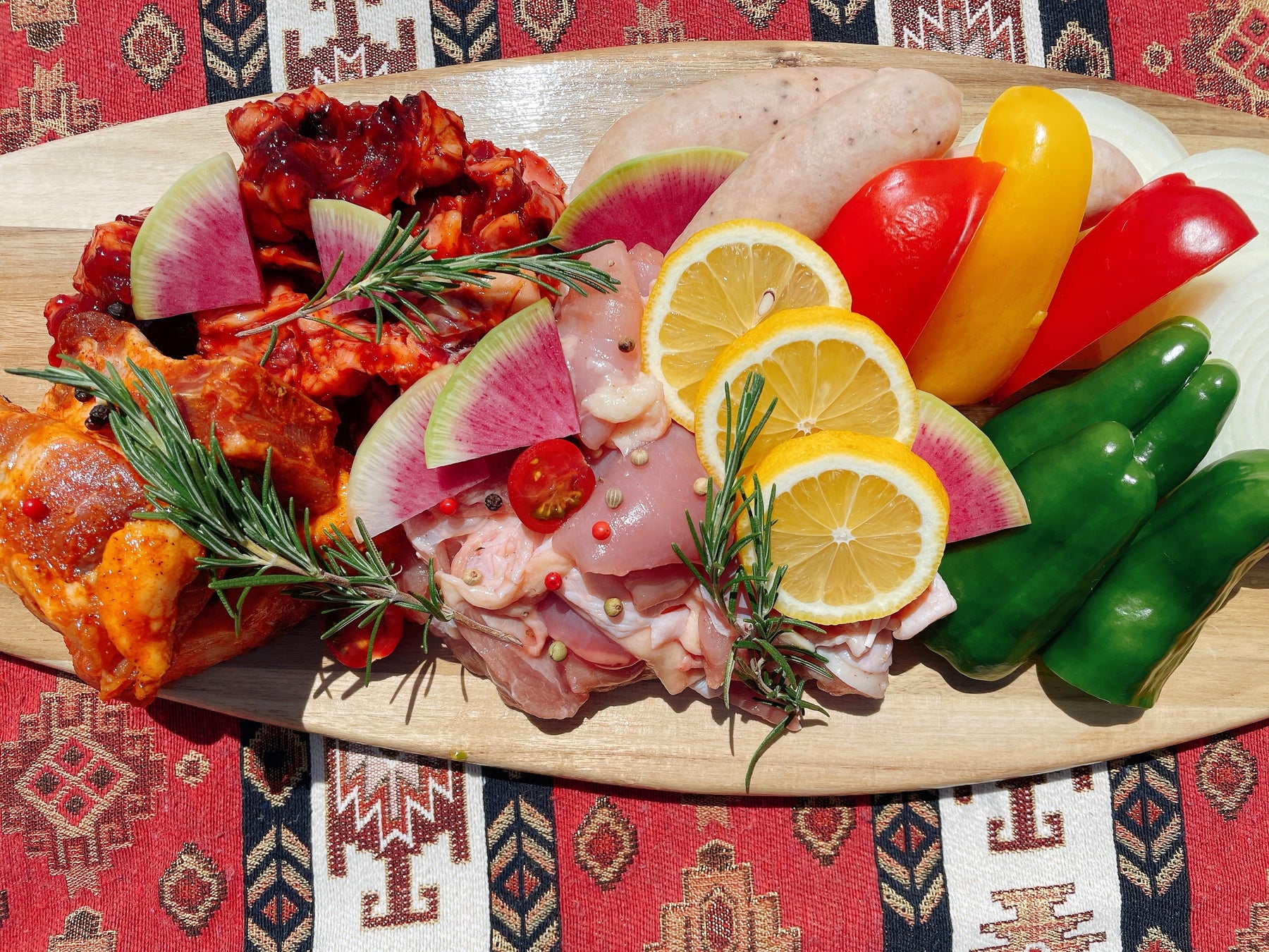 リブフィンガー、豚肩ロース、ハーブチキン、ソーセージ、玉ねぎ、ピーマン、スイートコーン、ニンジン、メガマシュマロ