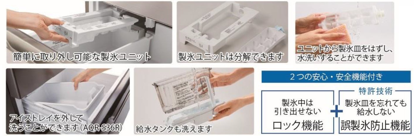 FREEZIA+シリーズに初搭載された自動製氷機能。製氷ユニットは簡単に付け外し可能で、水洗いもできるので、いつも清潔にお使いいただけます。また、製氷中に製氷ユニットを引き出せないロック機能や、製氷皿をセットし忘れた際に給水しない誤製氷防止機能も搭載しています。