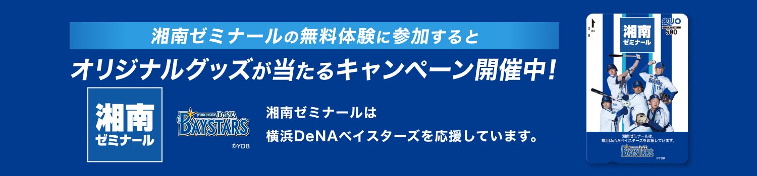 キャンペーン期間中に湘南ゼミナール総合進学コースの無料体験にお申込みいただいた方の中から抽選で4,580(ヨコハマ)名に「横浜DeNAベイスターズ」オリジナルQUOカード500円分をプレゼントいたします。