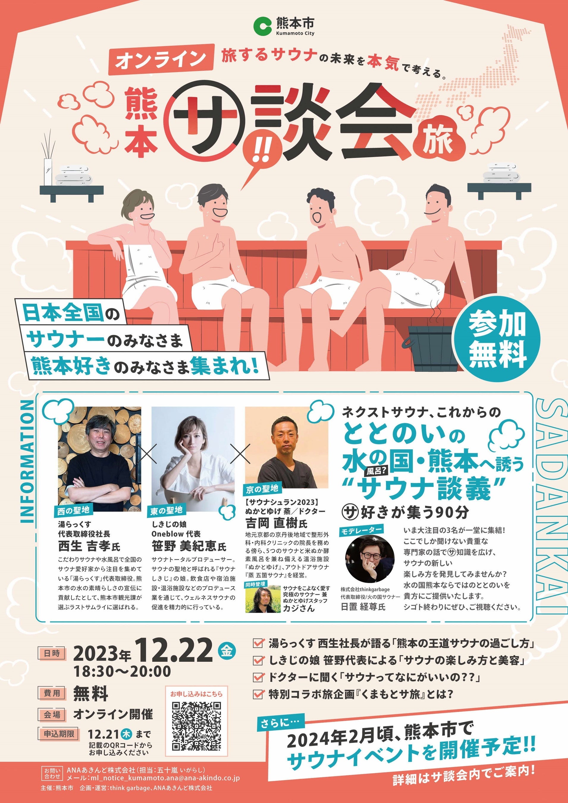 今回は、本市が「蛇口をひねればミネラルウォーター」と言われる世界に誇る地下水都市であることから、その水を使ったサウナをテーマにした「熊本サ談会(オンラインイベント)」を以下のとおり開催しますので、お知らせします。