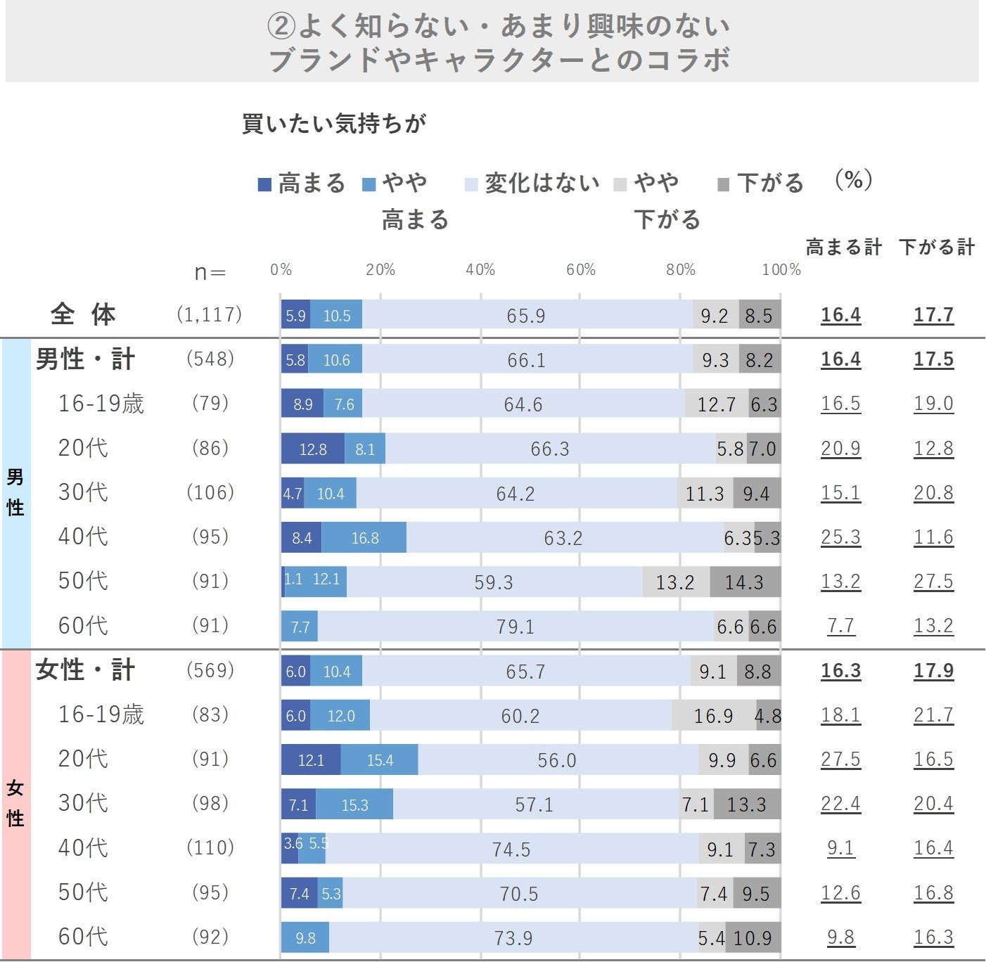 ②よく知らない・あまり興味のないブランド・キャラクターの場合は、全体では「変化はない」が65.9%を占め、「高まる計」「下がる計」それぞれ2割弱に留まります。