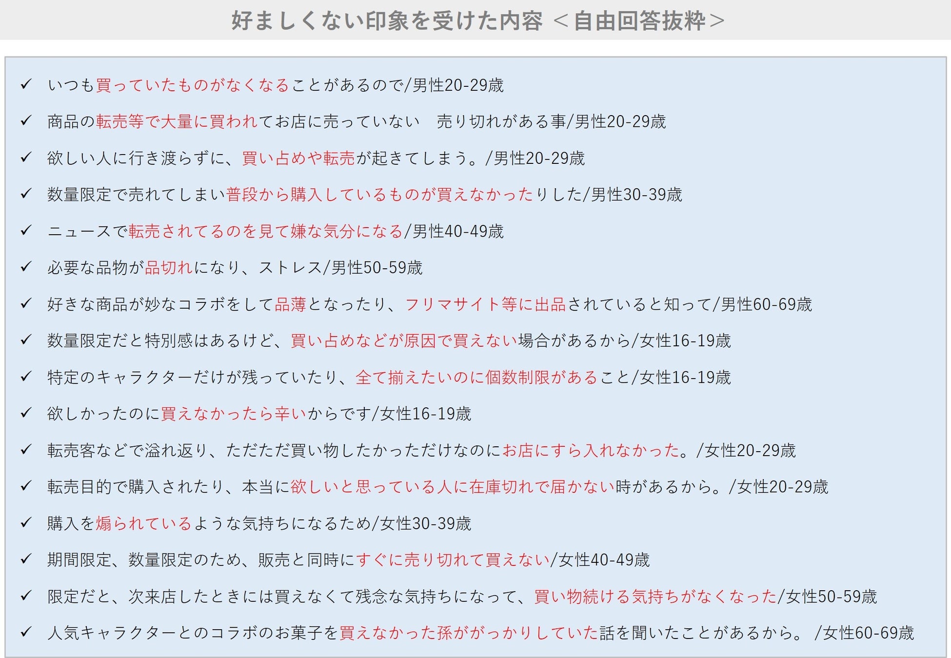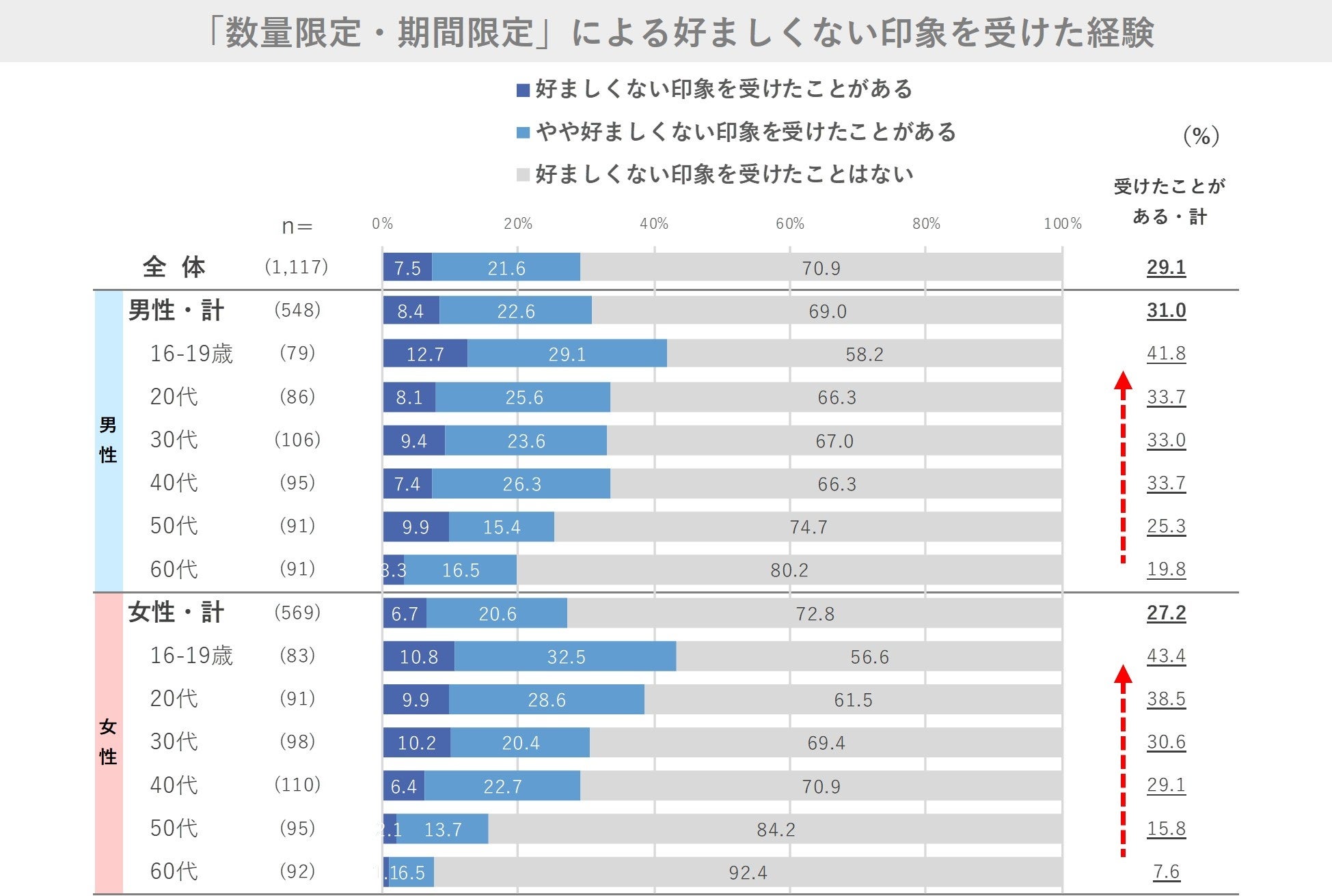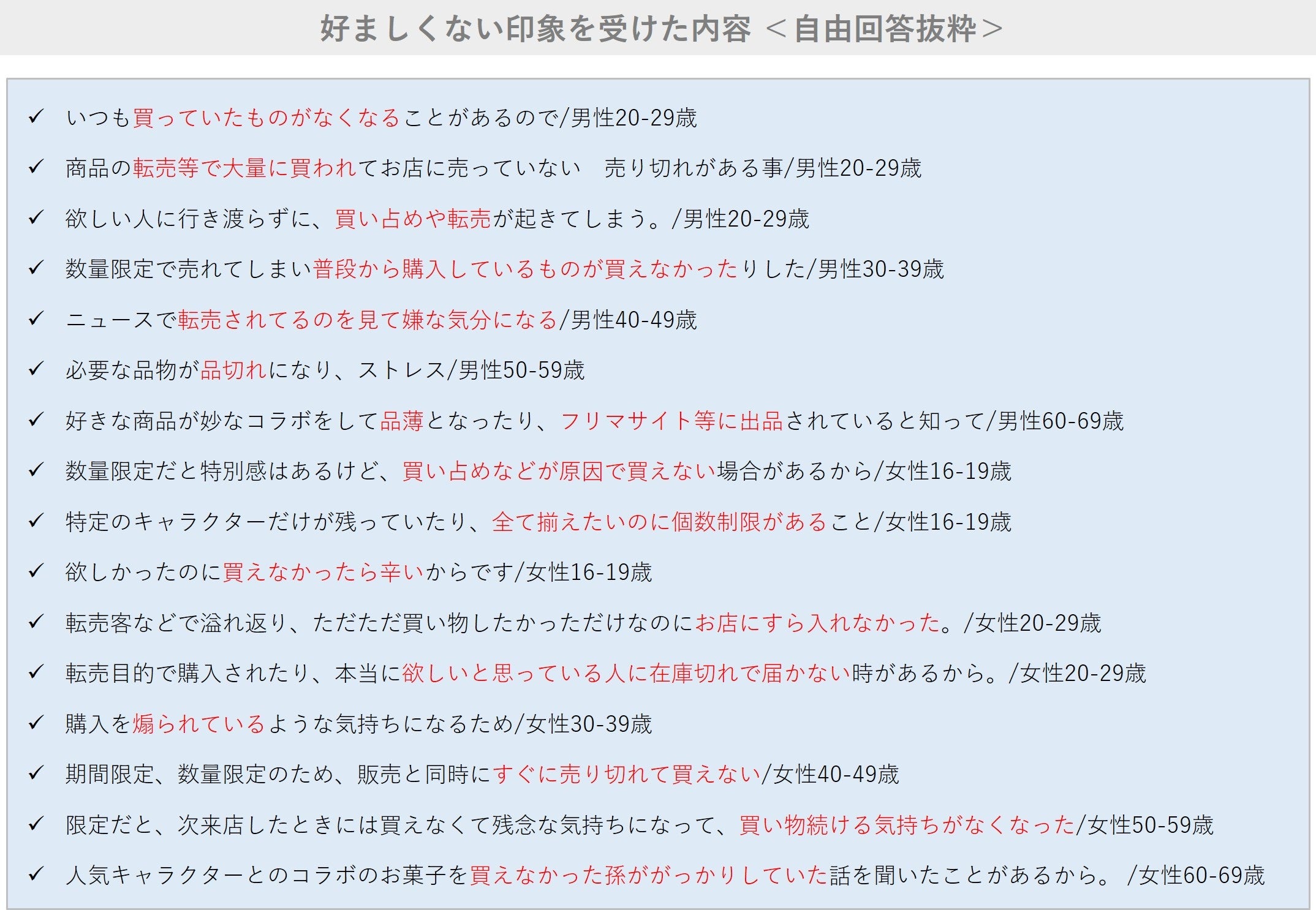 「数量限定・期間限定」によって、全体では「好ましくない印象を受けたことがある」7.5%、「やや受けたことがある」21.6%で、合わせて約3割が好ましくない印象を受けた経験がある。要因としては「買い占めや転売による入手のしづらさ」や「店舗の混雑」に対する嫌悪感、「普段のユーザーが買いにくくなる」など。