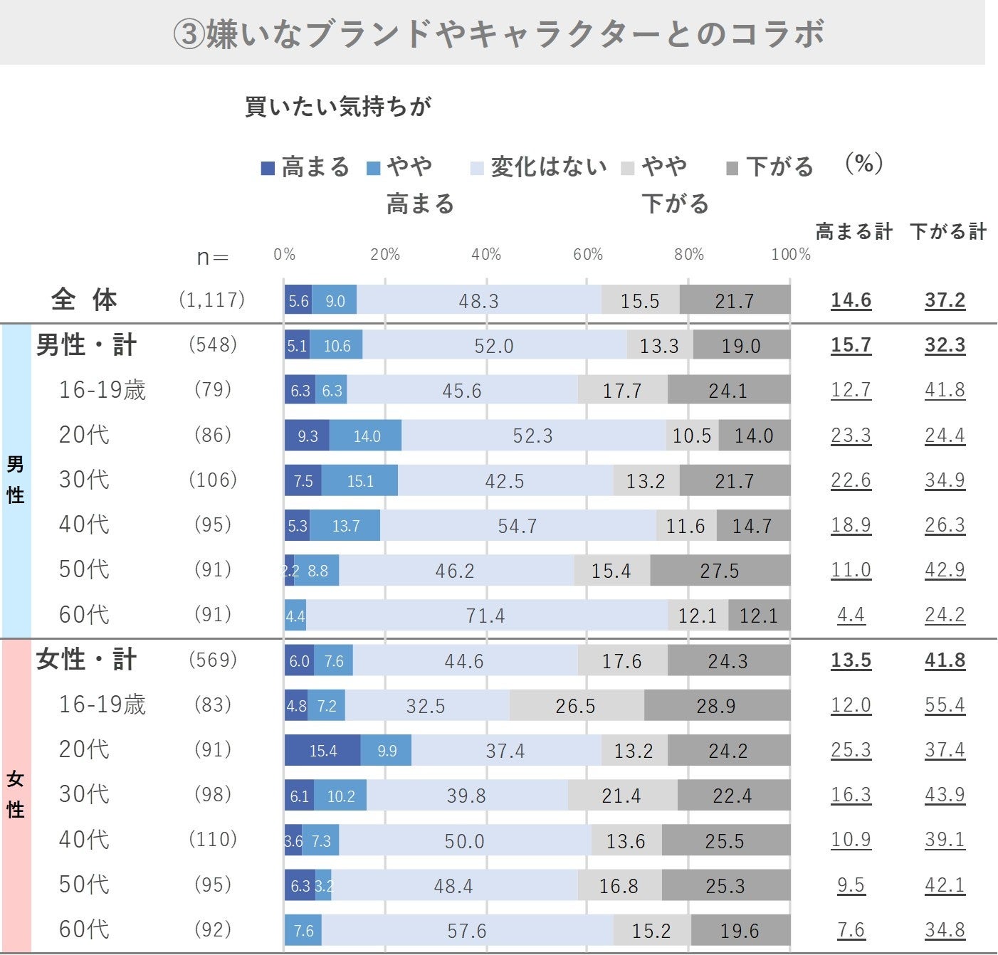 ③嫌いなブランド・キャラクターの場合は、全体では「変化はない」が48.3%を占めますが、「下がる計」が37.2%に及びます。