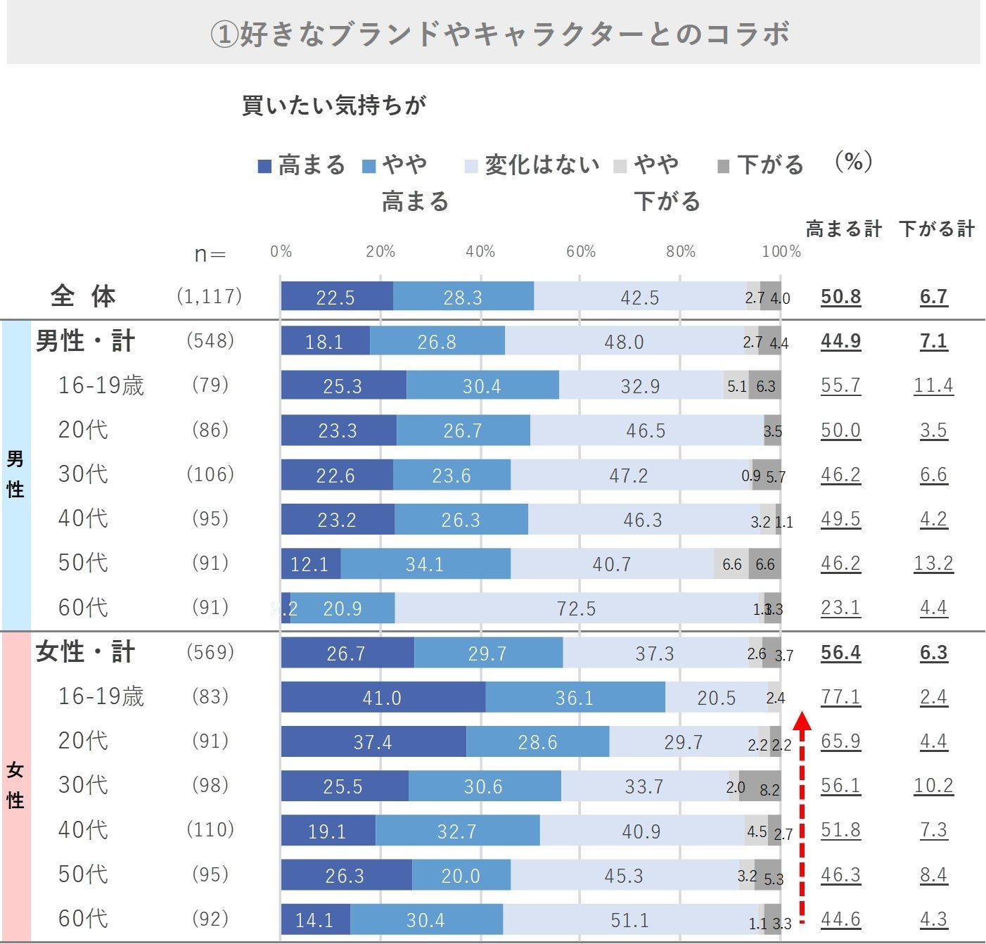 「コラボ」先による購入意向の変化は、①好きなブランド・キャラクターの場合は、全体では「高まる計」が50.8%を占めます。女性の若年層ほど購入意向が高まる傾向です。