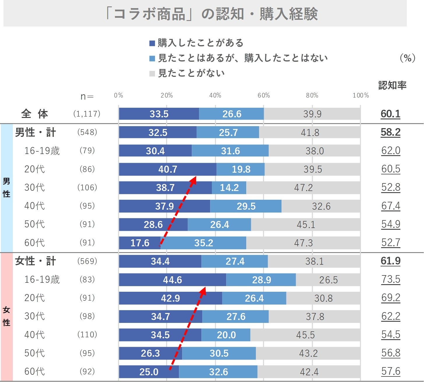 「コラボ商品」の認知率は全体で60.1%、購入経験率は全体で33.5%です。購入経験率は男女それぞれ若年層ほど高くなる傾向でした。