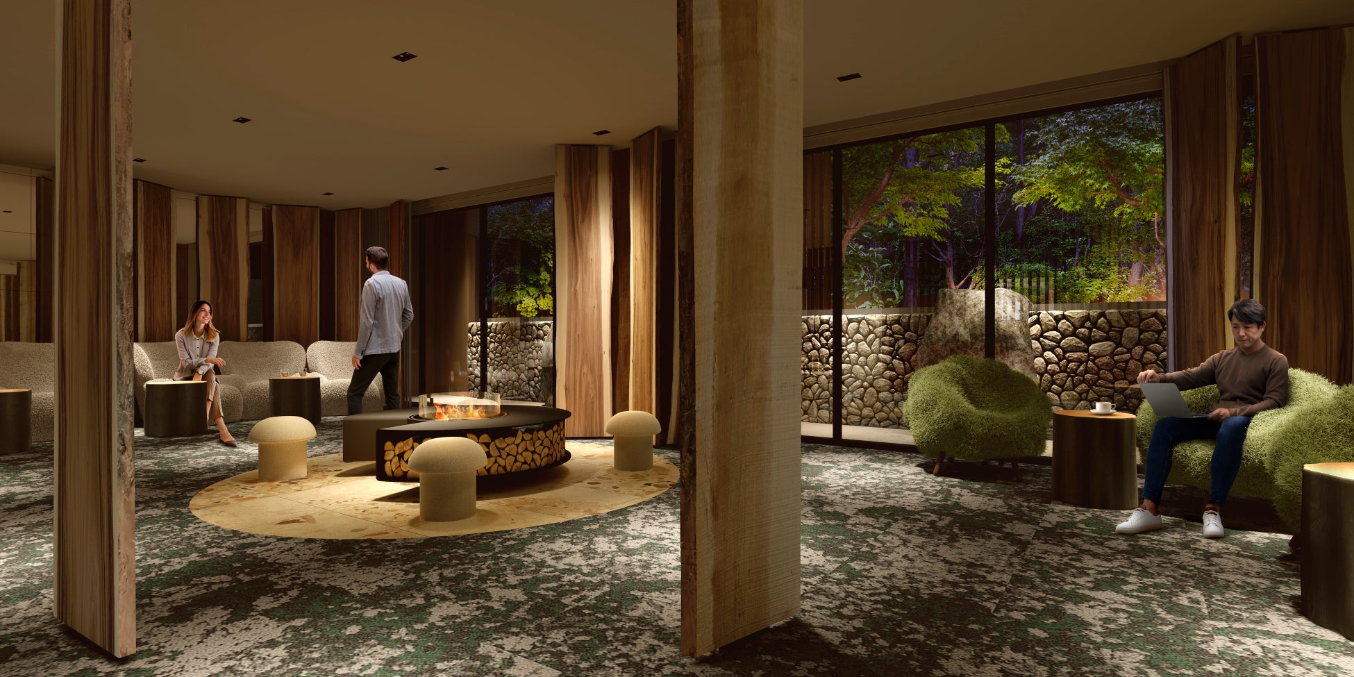 チェックイン後のひとときや湯上がりの時間、ナイトキャップには、軽井沢の“緑”をイメージしたラウンジでリラックス。暖炉のゆらめく炎を眺めながら、お好きなドリンクやスナックを自由にお楽しみいただき、思い思いの時間をお過ごしください。