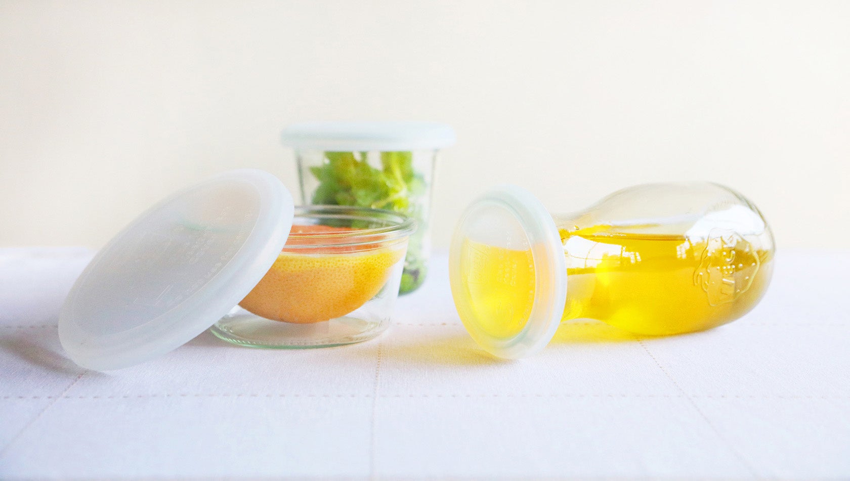 シリコーンキャップは、簡単に開け閉めができるのに密閉性が高く、横に倒しても液漏れのないWECKキャニスター専用フタです。