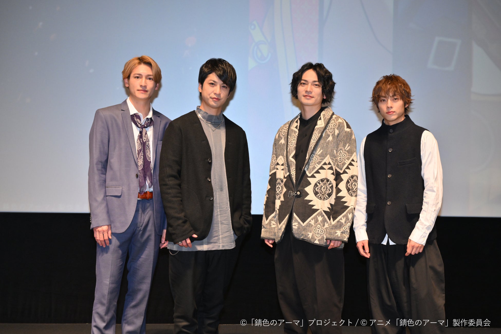 アニメ「錆色のアーマ −黎明−」第1話先行上映会&トークライブが、12月30日(木)ユナイテッド・シネマ豊洲にて開催。舞台を起点とした“逆2.5次元”のメディアミックスプロジェクトである本作で、舞台版からそれぞれの役を創り上げてきた荒木健太朗(鶴首役)、永田崇人(蛍火役)、平田裕一郎(黒氷役)、神里優希(アゲハ役)が、アニメの監督を務めた河原真明とともに、作品のみどころや舞台での思い出、アフレコでの苦労話を展開した。MCは、お笑いタレントで声優としても活躍する天津の向清太朗。