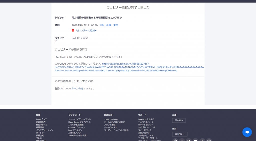 上記のご登録が完了すると、Zoom視聴用のURLが発行されます。