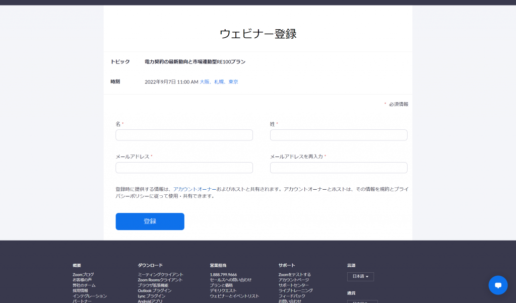 メール内のZoomURLを開くと以下の画面に遷移しますので、お名前とメールアドレスのご登録をお願いいたします。