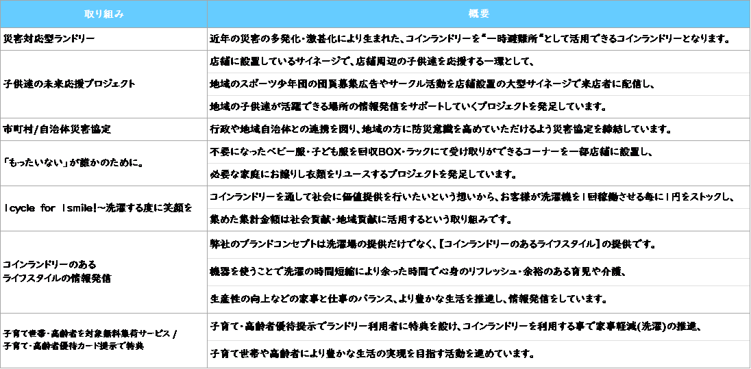 この取り組みは、弊社が通年テーマとしている「1cycle for 1smile!~洗濯する度に笑顔を」の1つで、コインランドリーを通して社会に価値提供を行いたいという想いから、お客様が洗濯機を1回稼働させる毎に1円をストックし、集めた集計金額は社会貢献・地域貢献に活用するという取り組みです。