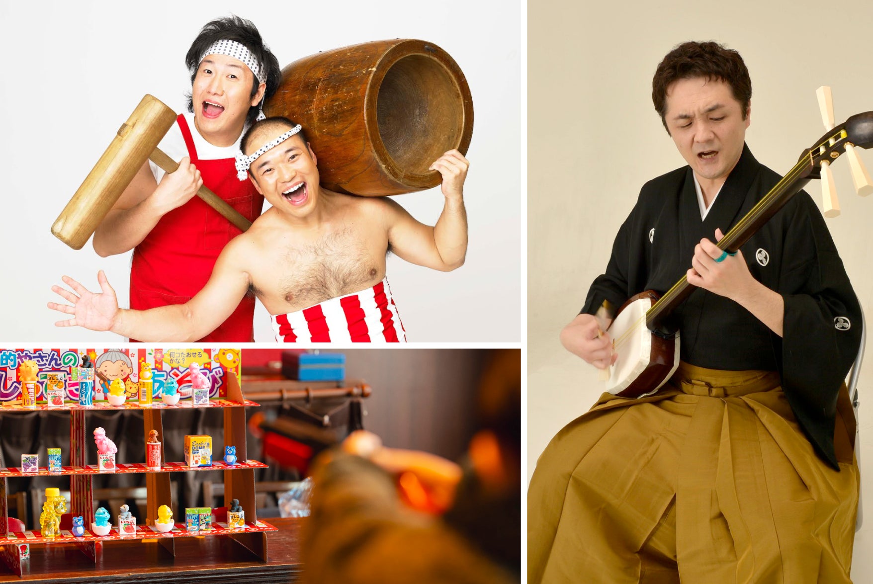 力士と一緒に行う餅つきや射的といったお子さま向けのアクティビティ、人気芸人によるおめでたい