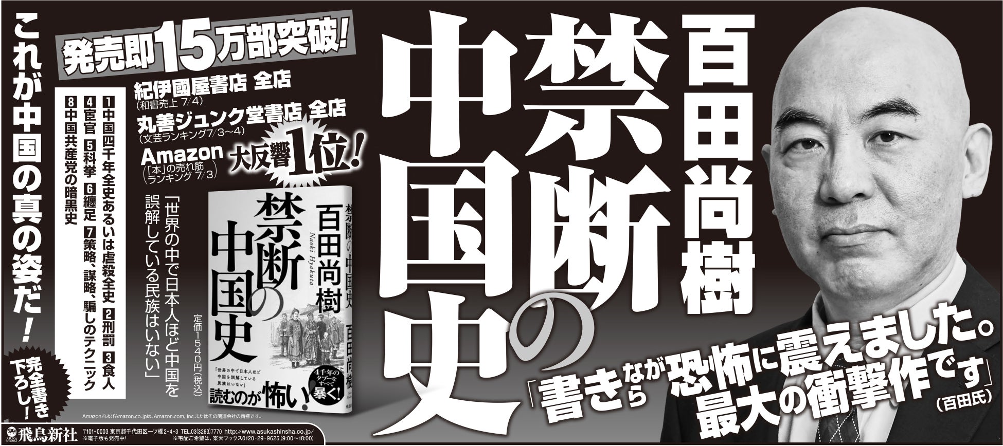 作家・百田尚樹氏の『禁断の中国史』(飛鳥新社刊)が爆売れ!6月30日発売から続々重版決定で早くも15万部を突破!全国から大反響と大絶賛の嵐!