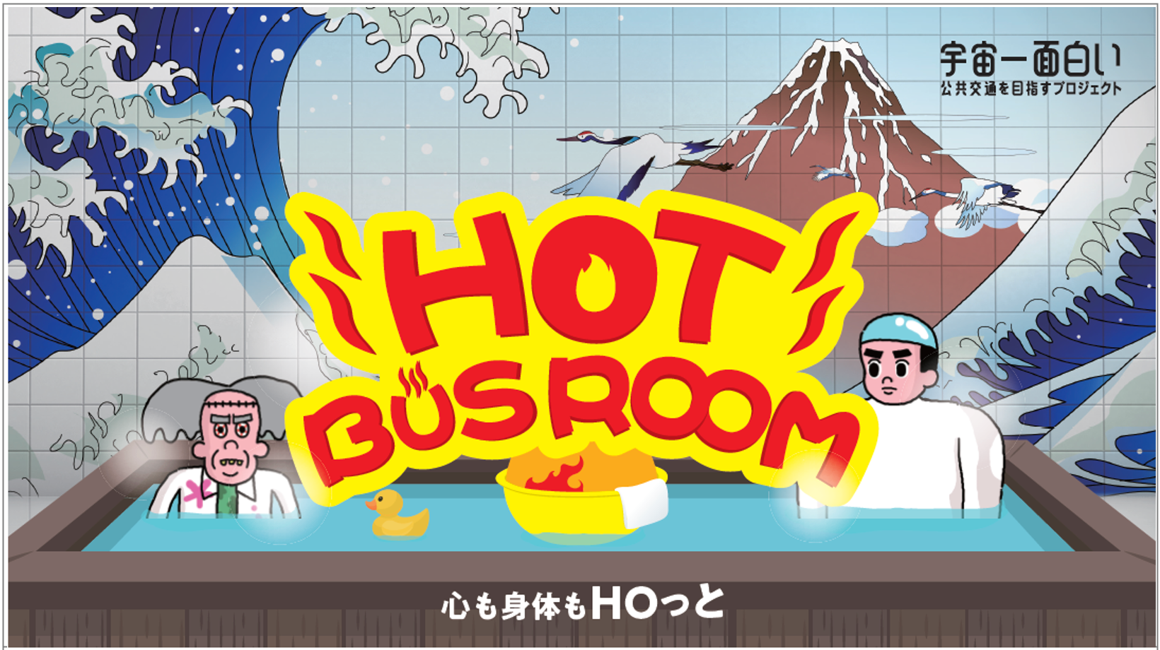 12月は企画バス「HOT BUS ROOM」です(12月17日から運行開始)。気温が下がる12月、バスに乗った際には心身ともに温かくなっていただこうという企画を、ホスピタリティを持って真剣に考えました。皆様にご好評をいただいております”押しボタン芸“では、寒くなると聞きたくなるあの芸人さんとのコラボが実現しました!