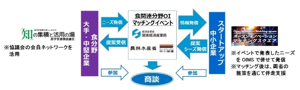 農林水産省と経済産業省関東経済産業局は、両省が持つオープンイノベーションの取組(『「知」の集積と活用の場』及び「オープンイノベーション・マッチングスクエア(OIMS)」)を連携させ、「食関連分野オープンイノベーション・チャレンジピッチ」(以下「OIチャレンジピッチ」)を開催します。