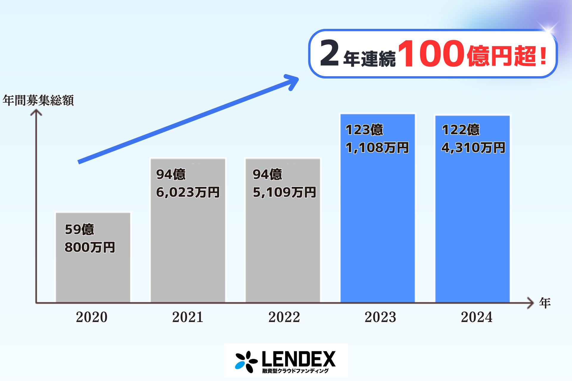 融資型クラウドファンディング「レンデックス(LENDEX)」を運営する株式会社LENDEX(本社:東京都渋谷区、代表取締役:中村 智)は、2023年および2024年の年間資金募集総額がそれぞれ123億1,108万円、122億4,310万円となり、2年連続で100億円超を達成したことをお知らせいたします。