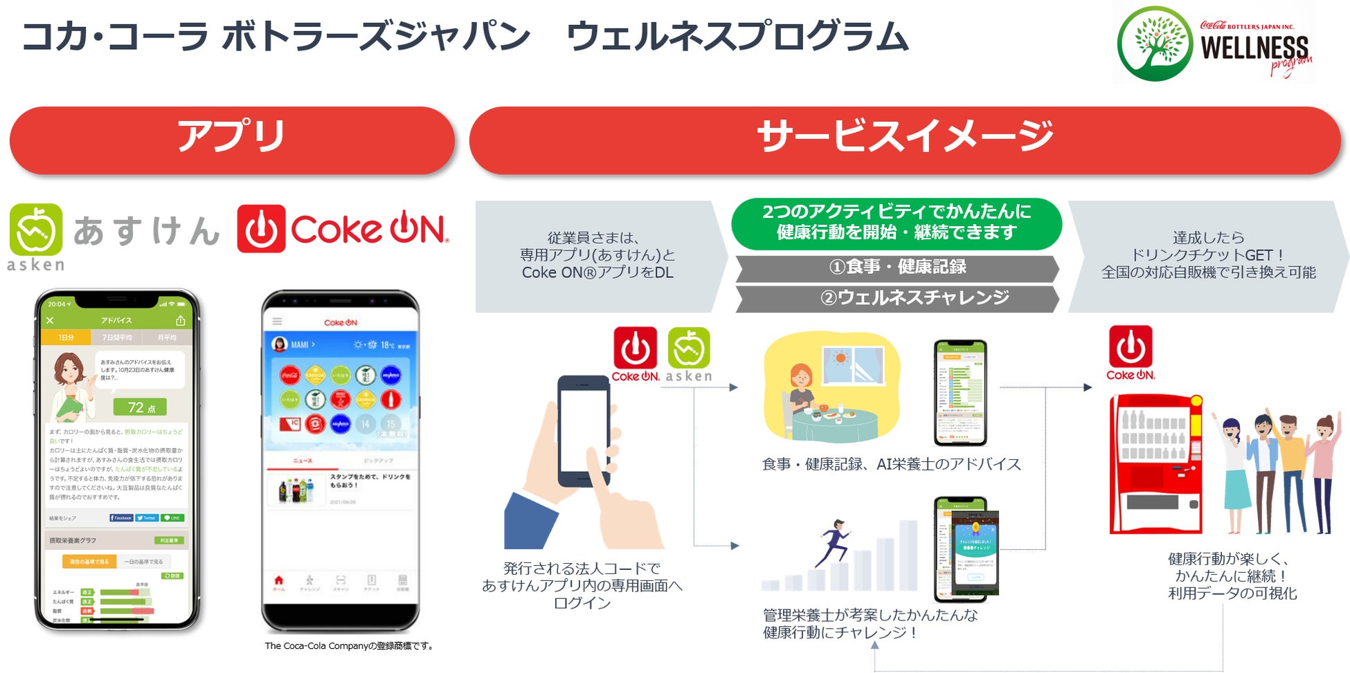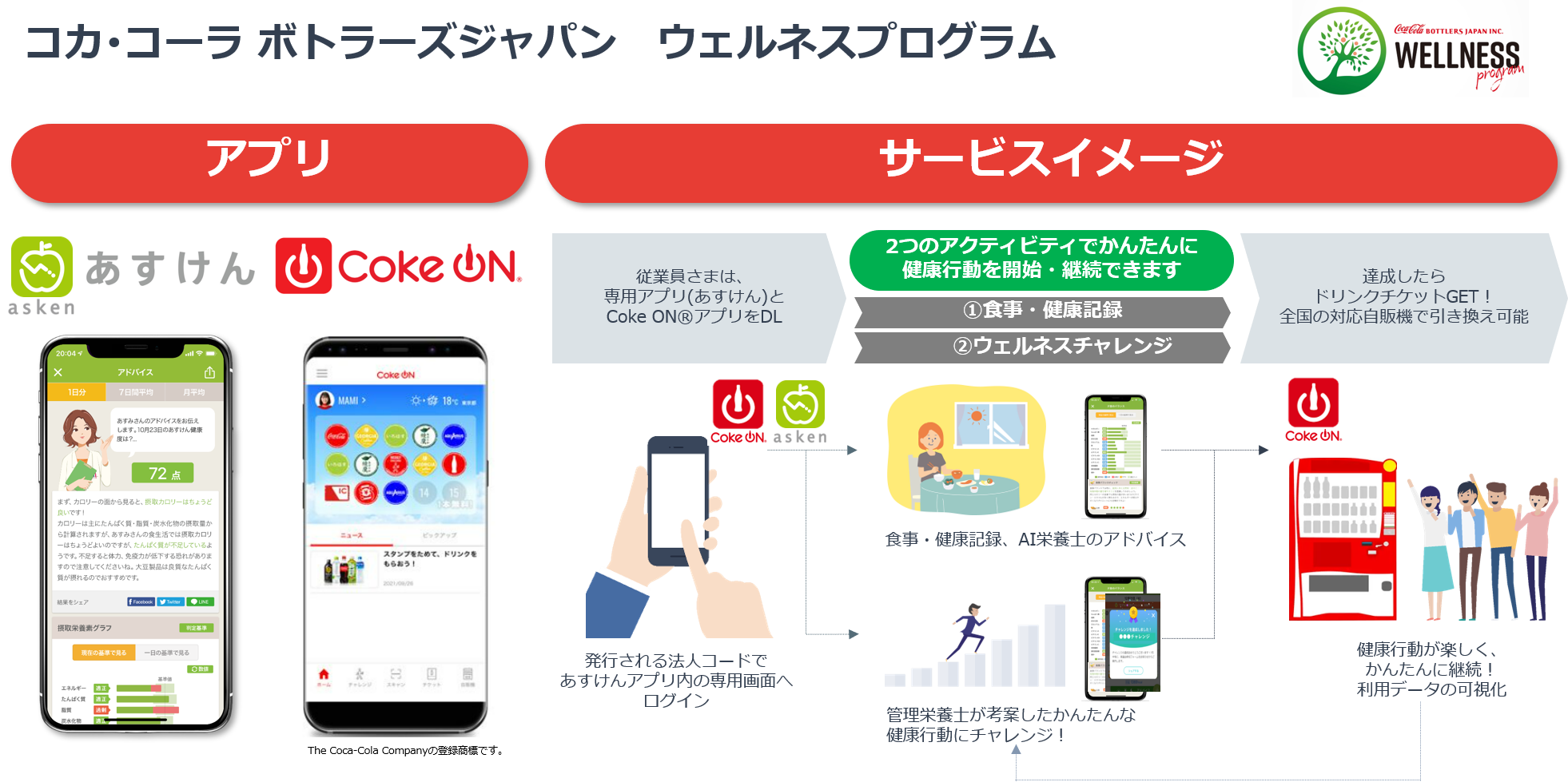 「ウェルネスプログラム」は、当社自動販売機を設置した企業が費用無料で導入できる、ヘルスケアアプリ「あすけん」とコカ・コーラ公式アプリ「Coke ON」(注1)が連動した、お得意さまの健康経営に向けた取り組みをサポートするプログラムです。