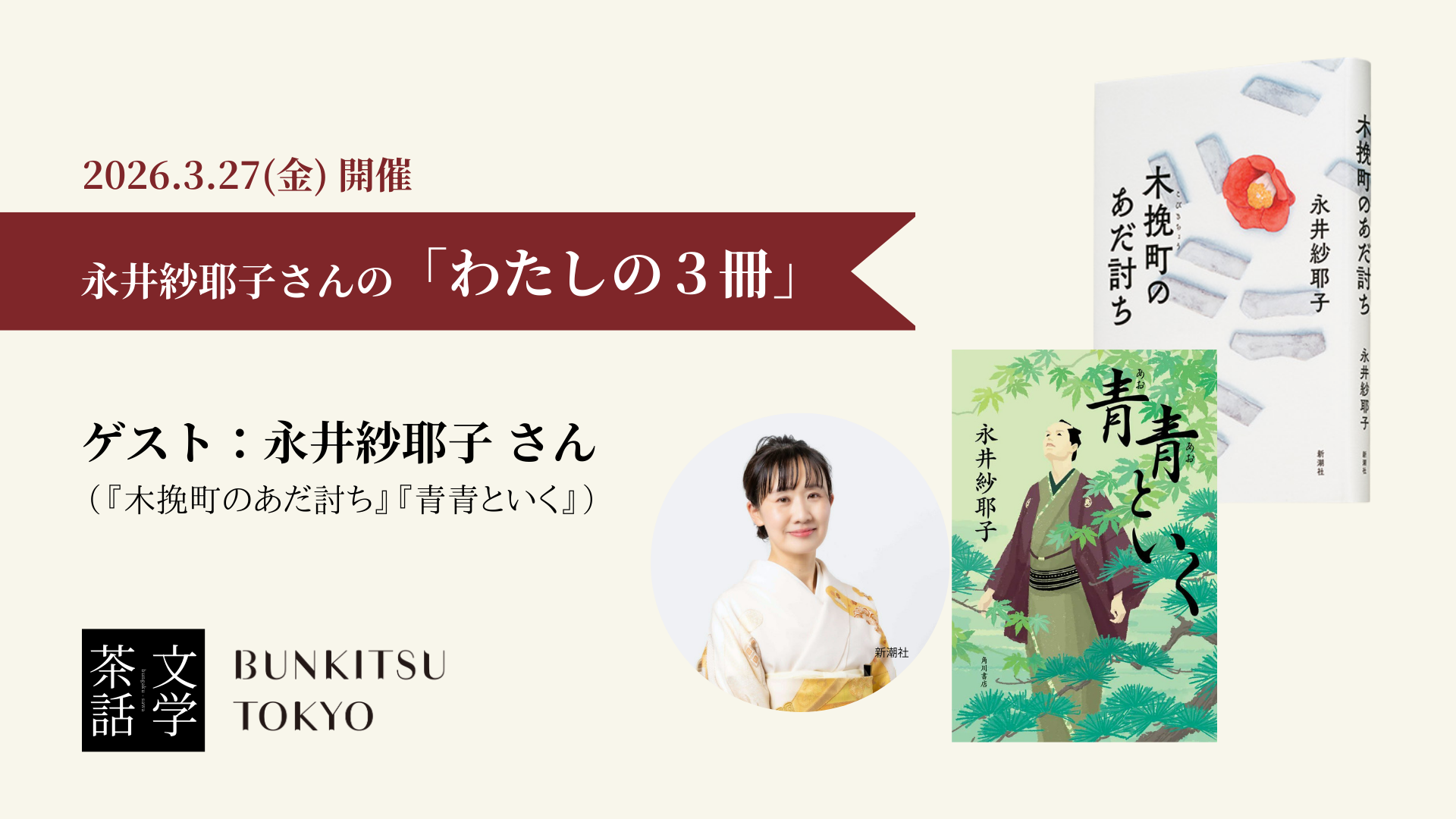 3月27日永井紗耶子さん(著書「木挽町のあだ討ち」)、4月以降、羽賀翔一さん、小林エリカさん、柚木麻子さん、岡本真帆さんら気鋭作家が登場するイベントへ優先的にご案内。