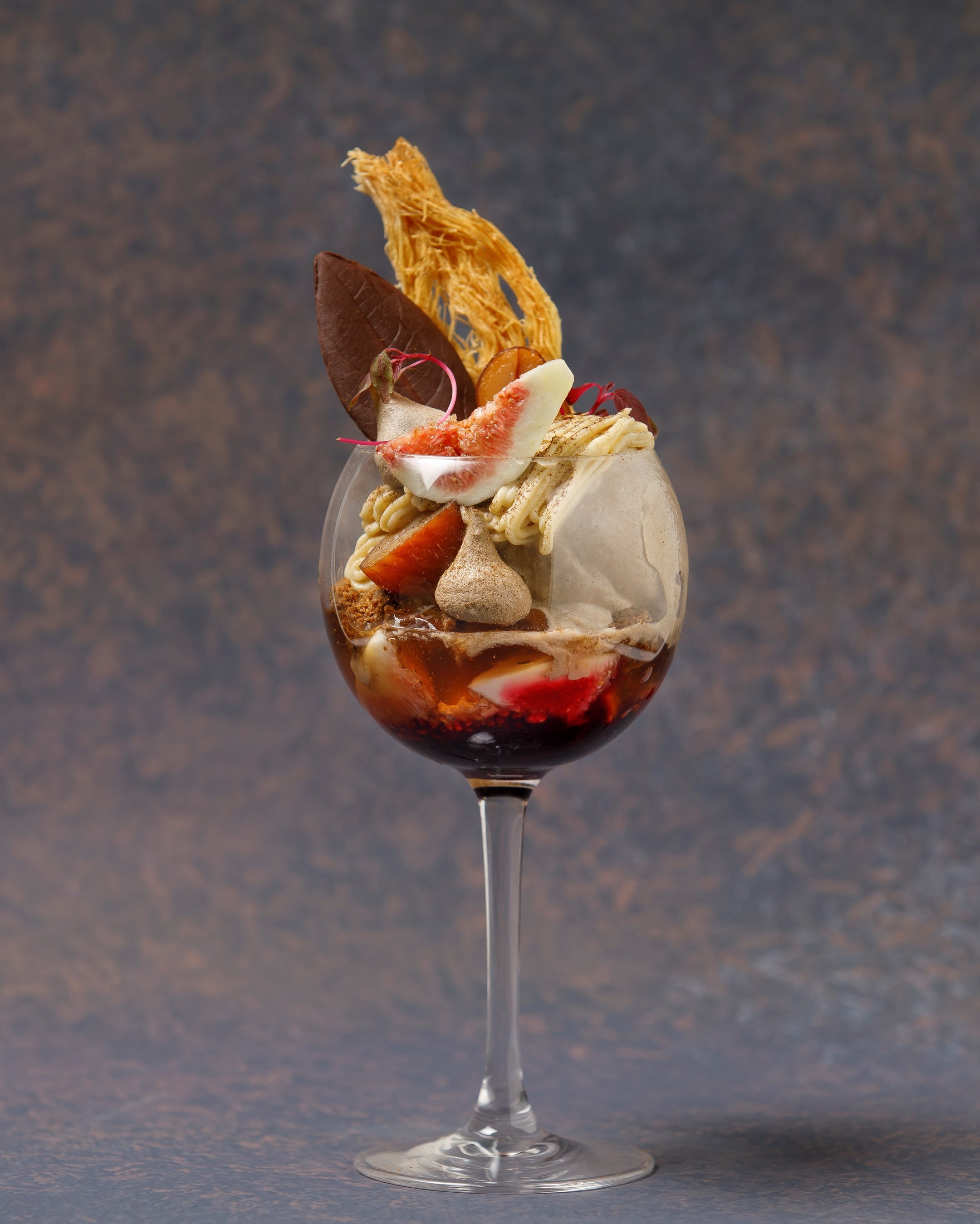 ほうじ茶の香りや旨味をたくさんお楽しみいただけるように、ほうじ茶のブリュレやクランブル、ジュレ、メレンゲ、アイスをバランスよくトッピングし、カシスの風味、イチジクの瑞々しい味わいに渋皮栗の甘露煮と濃厚な和栗のクリームをご一緒にお召し上がりください。