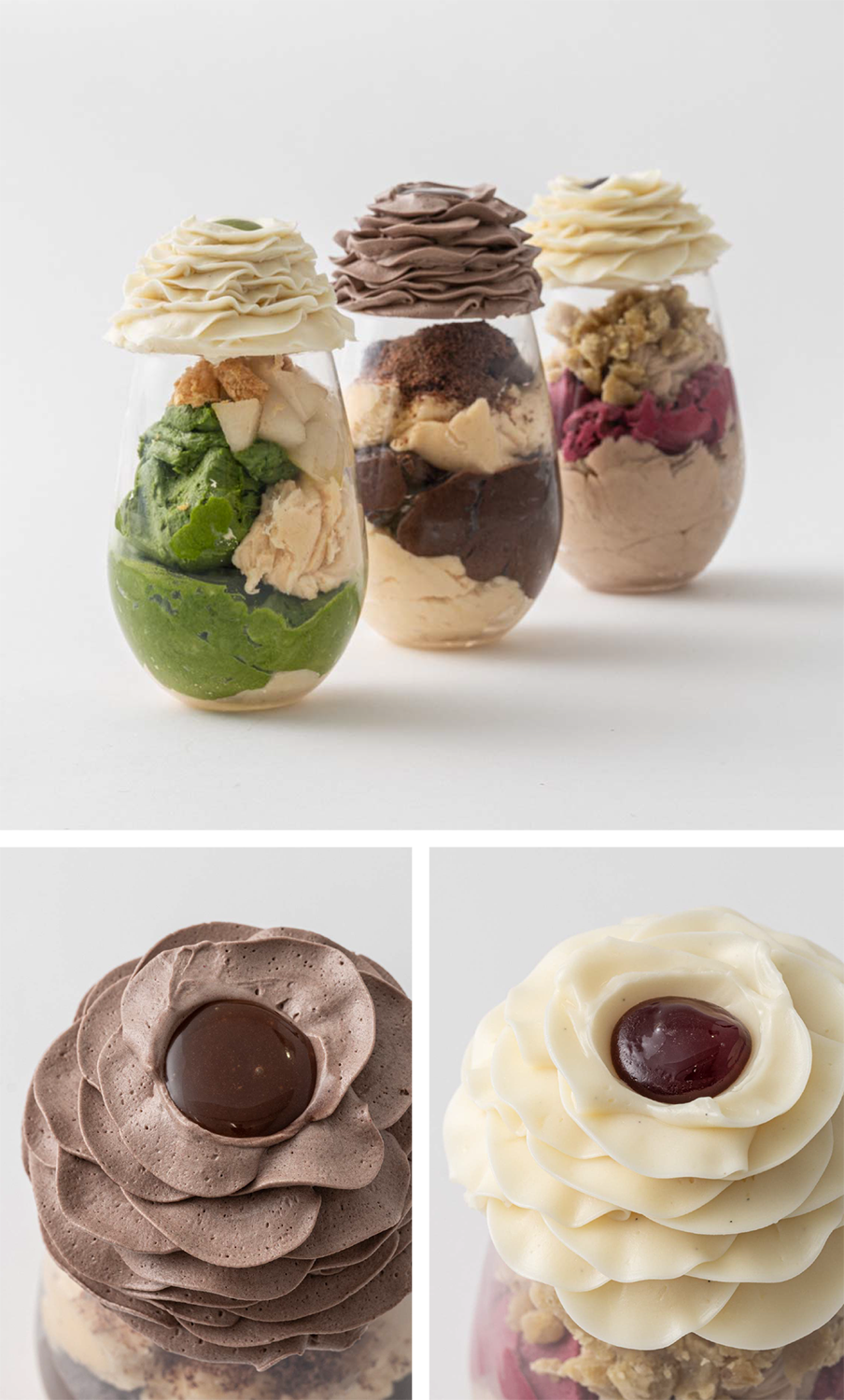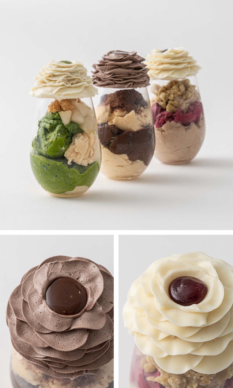 グラニテの爽やかさとトップの花形に絞った濃厚なクリーム、アクセントに入れた薄い板チョコレートの食感をお楽しみください。