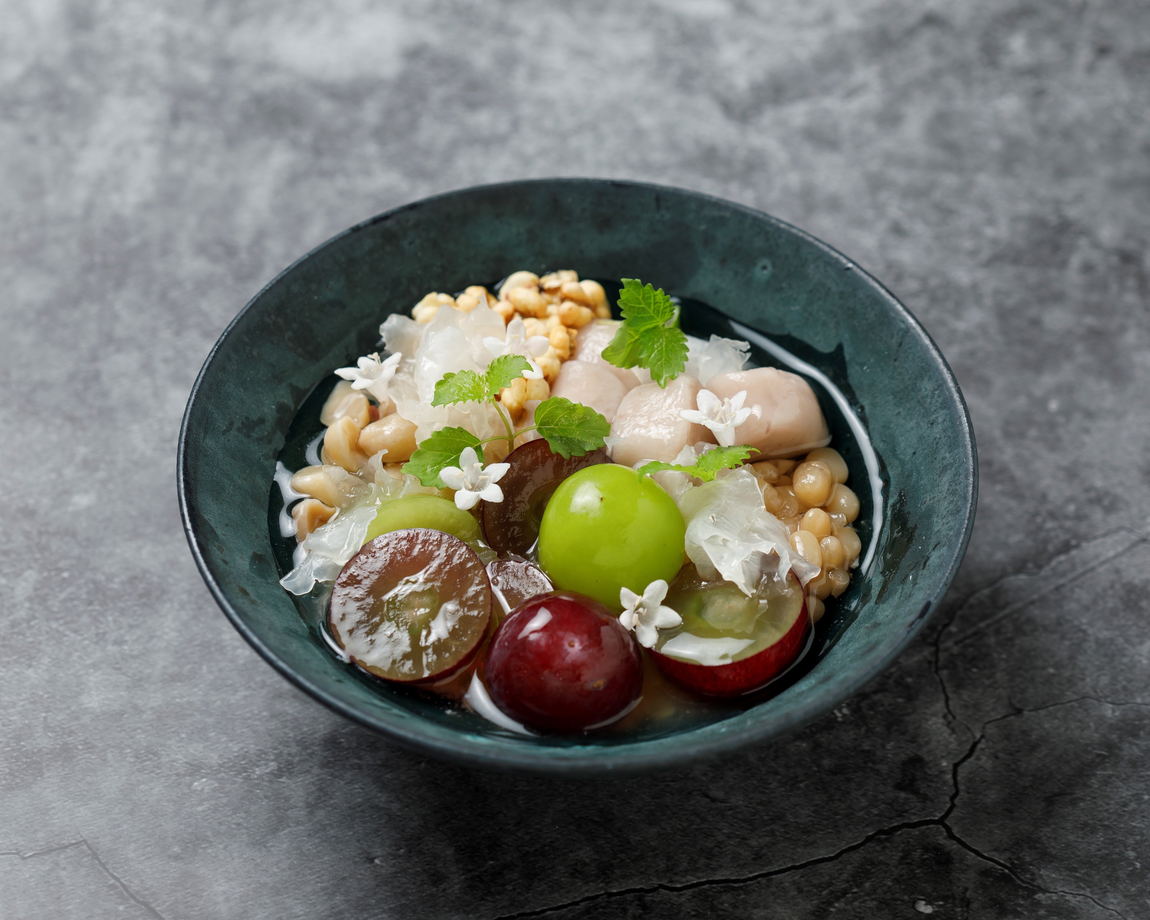 瑞々しい2種の葡萄をたっぷり使用した、秋限定の蓮花(豆花)。エルダーフラワーのコーディアルでマリネした白キクラゲや、タロイモ団子、ピーナッツなどをトッピングしました。別添えでお出しする、オリジナルのジャスミンシロップをかければ、より爽やかな味わいをお試しいただけます。