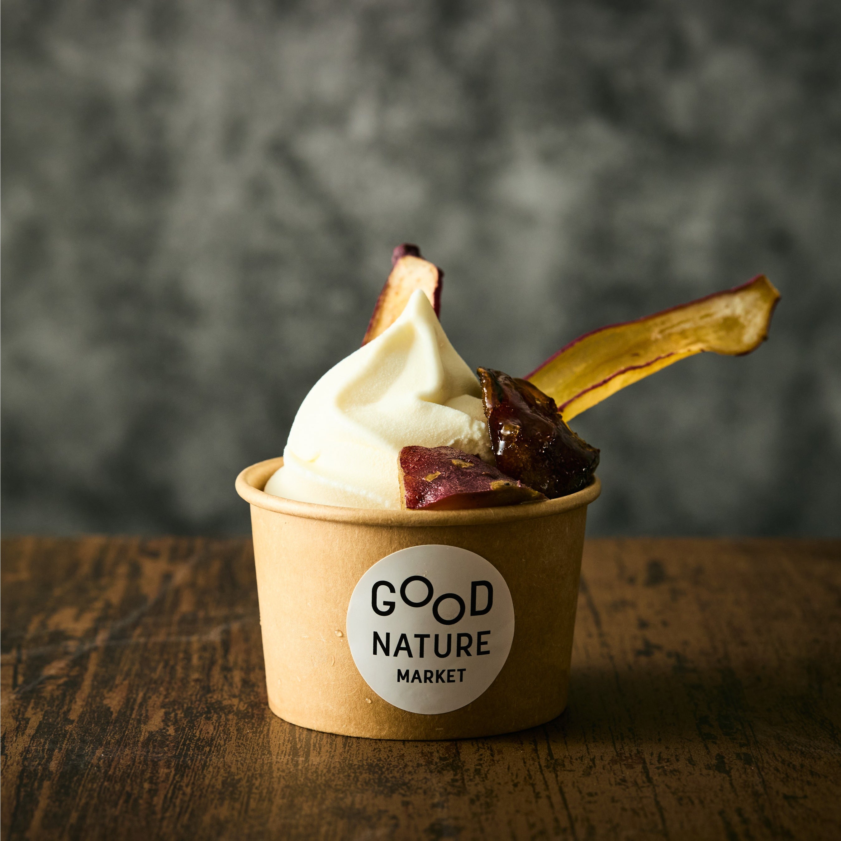 栗や美山牛乳のミルク感の強いソフトクリームに、ほくほくの大学芋とパリッと食感の芋チップスをトッピングしました。