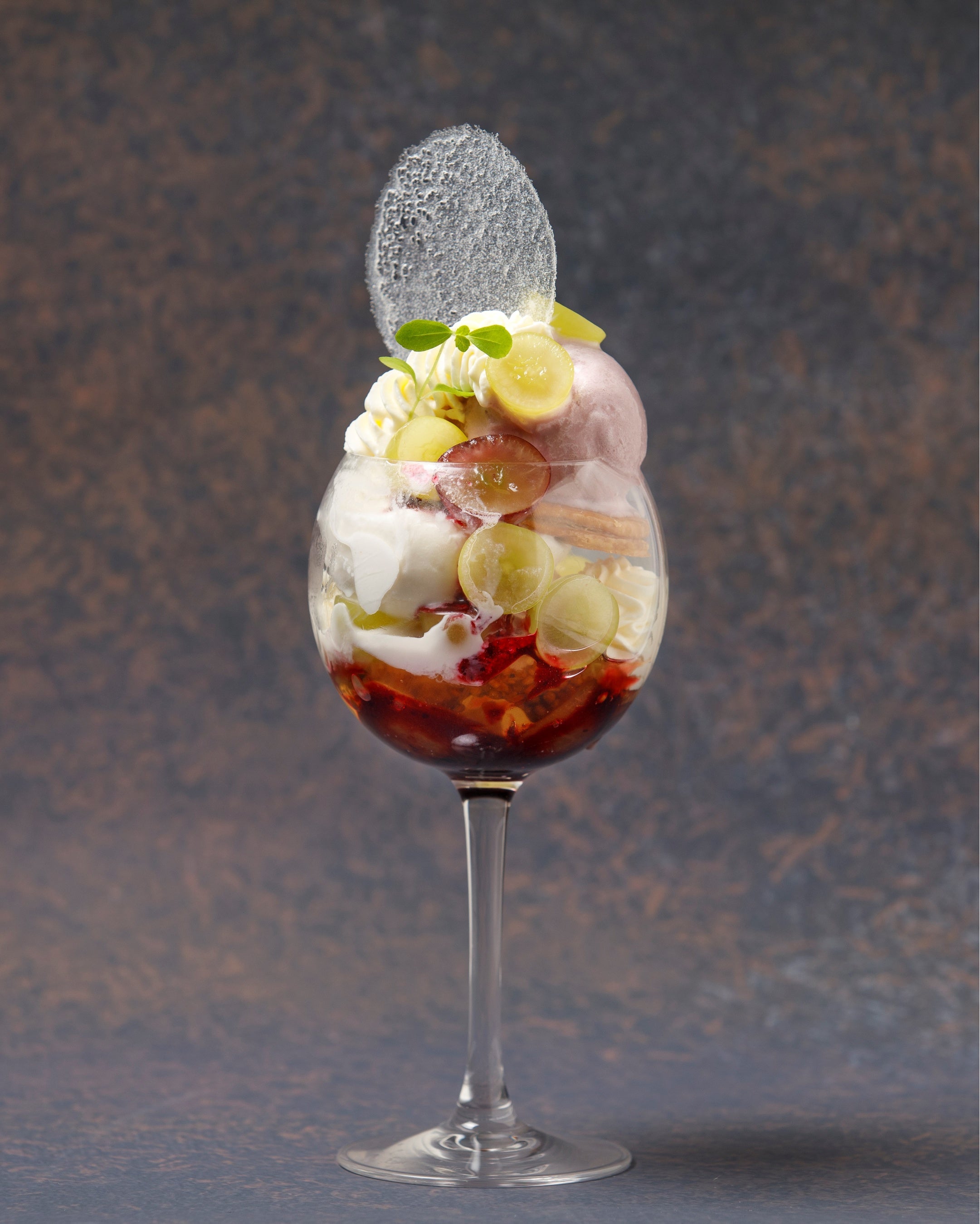 風味豊かなカシスのコンフィチュール、白ワインとマスカットのジュレに、マスカルポーネのムースやチーズクリームでコクを加え、甘味のアクセントにミルクアイス、ブドウのソルベをトッピングしました。