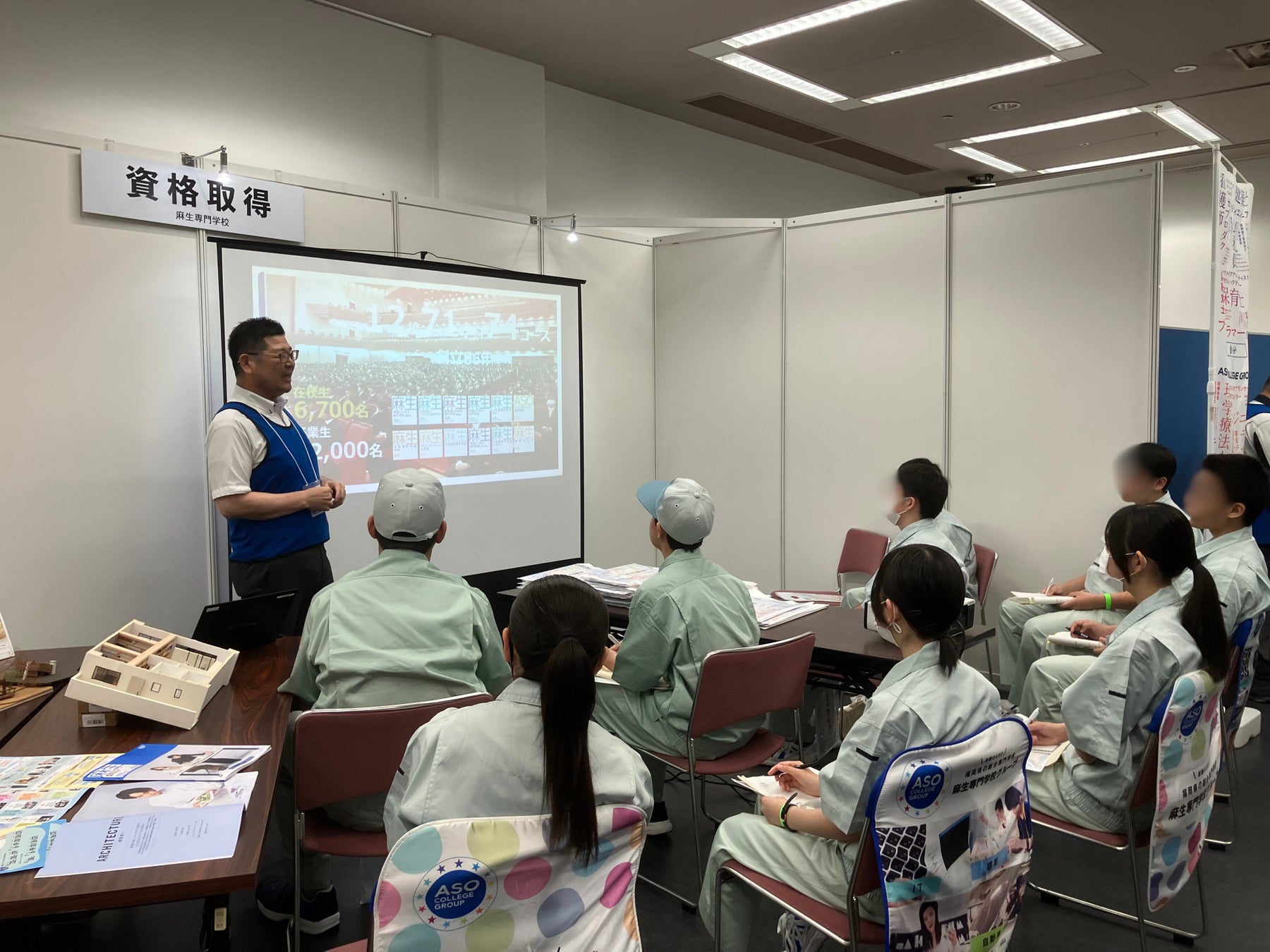 今回参加した高校生の多くは、就職を視野に入れており、イベントも職種体験を中心に構成されていました。そうした中で、麻生建築&デザイン専門学校の「資格取得ブース」では職種体験とは一味違う視点からの情報を発信。高校卒業後に「すぐに就職する」という選択肢だけでなく、「専門学校で学んでから就職する」道や、「就職後に学び直す」こともできるといった、多様なキャリアパスがあることを高校生に伝えることができました。