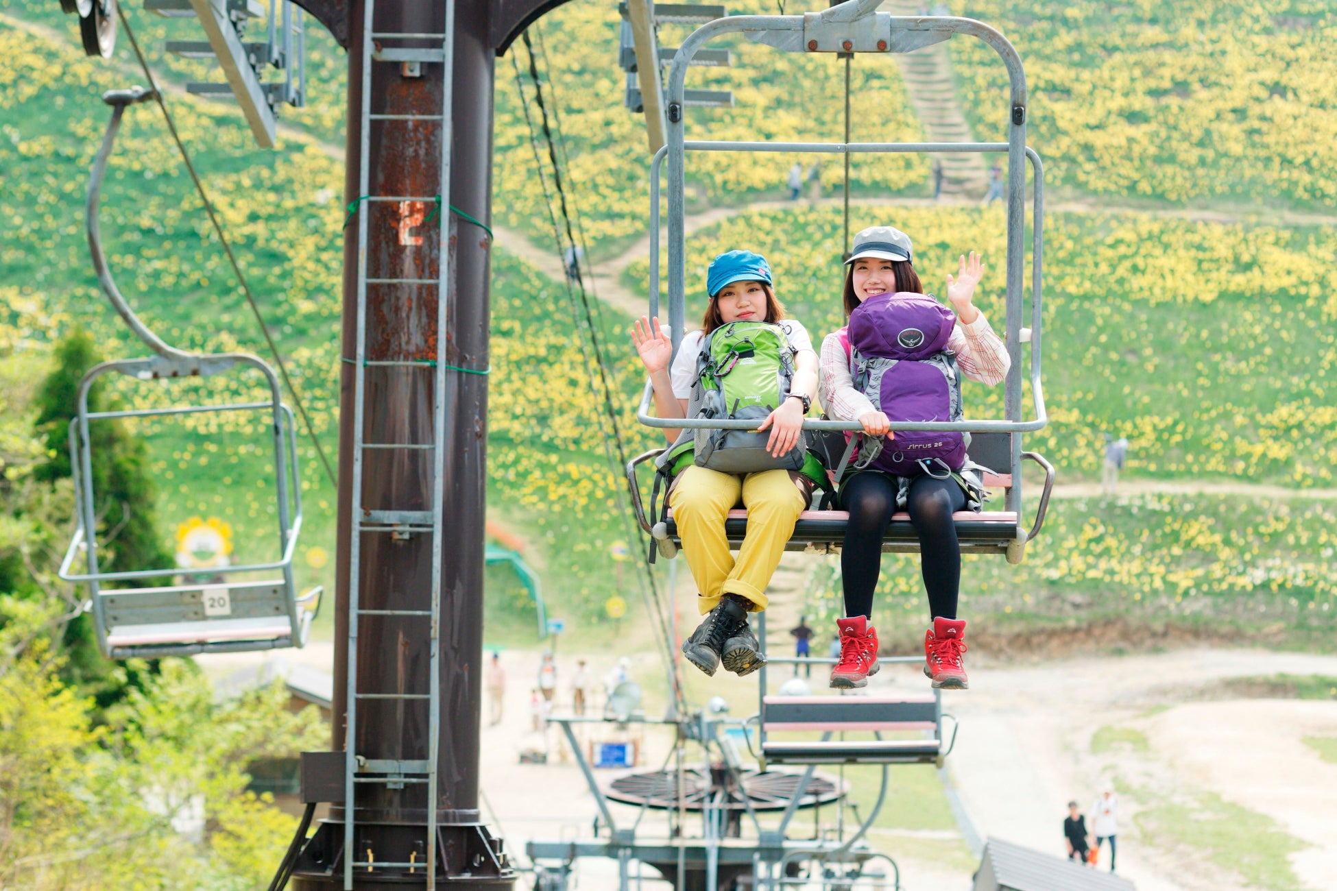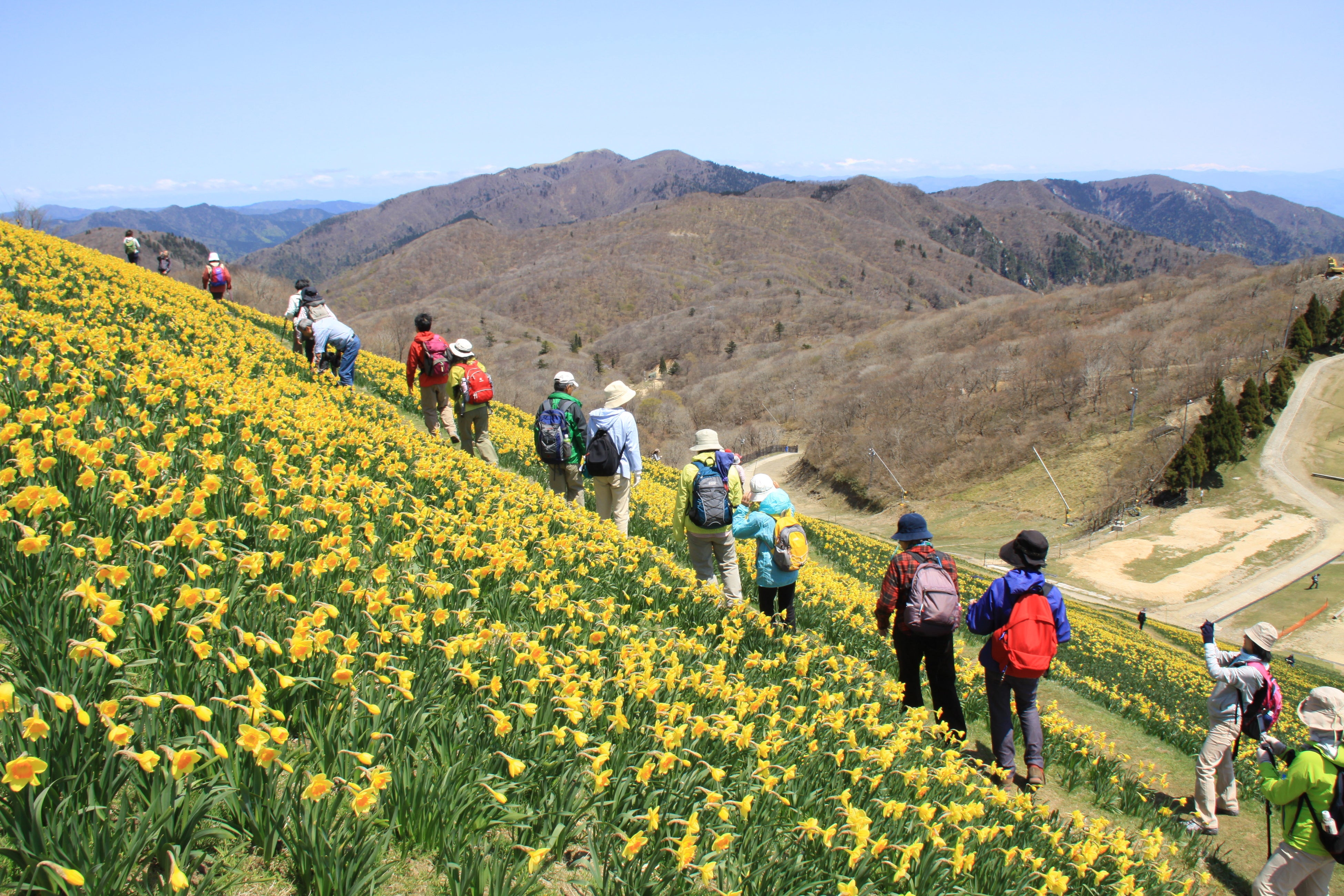 ロープウェイで山頂へ上がった後は、隣接する観光リフトでスイセンの丘へ。空中散歩を楽しみながらアクセスでき、到着前から広がる花景色に期待が高まります。また、スイセンの丘周辺から小女郎ヶ池方面へ続く尾根歩きハイキングコースも人気です。花を楽しみながら絶景ハイキングができるこの時期は、毎年多くの来場者でにぎわいます。