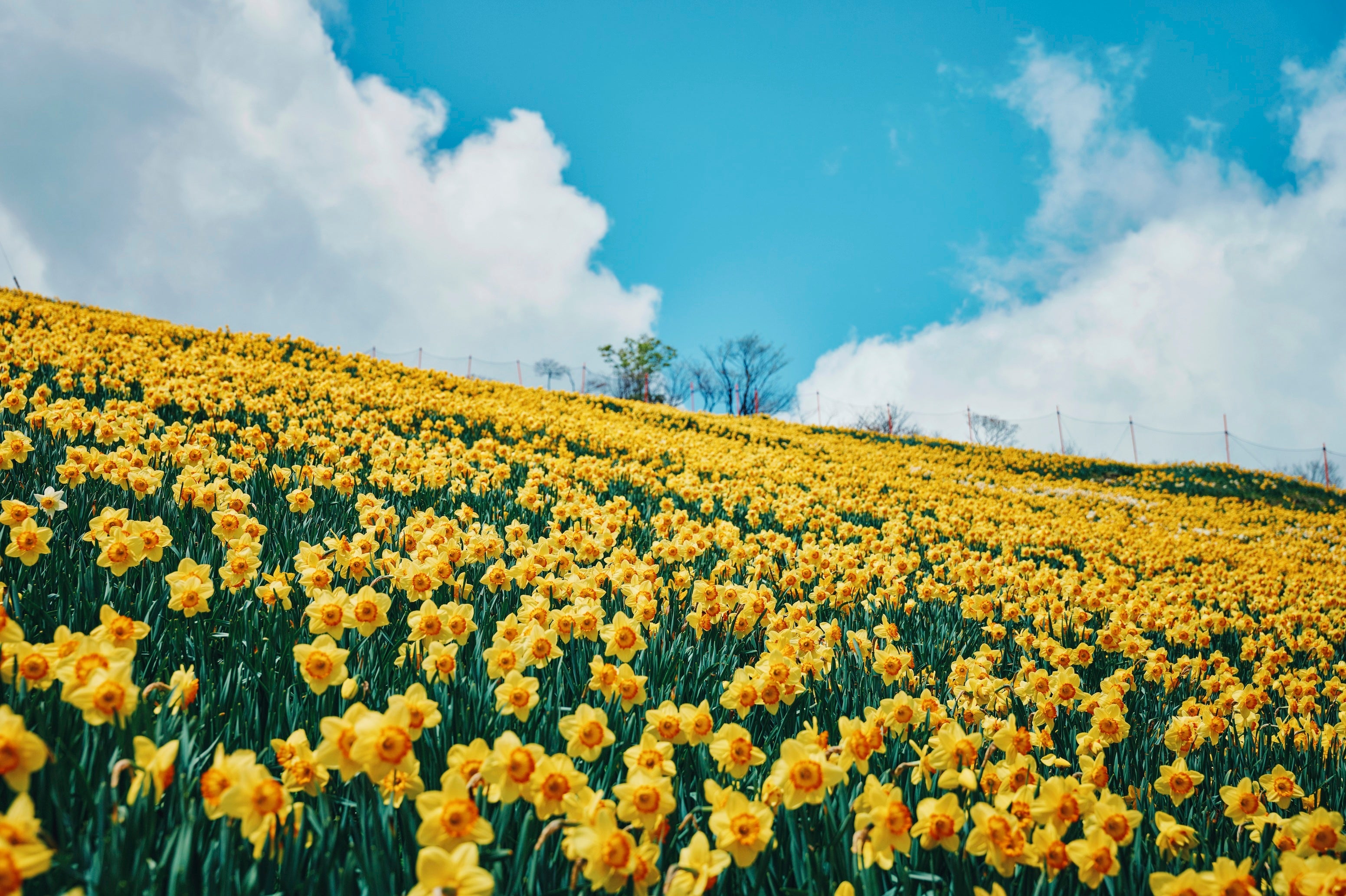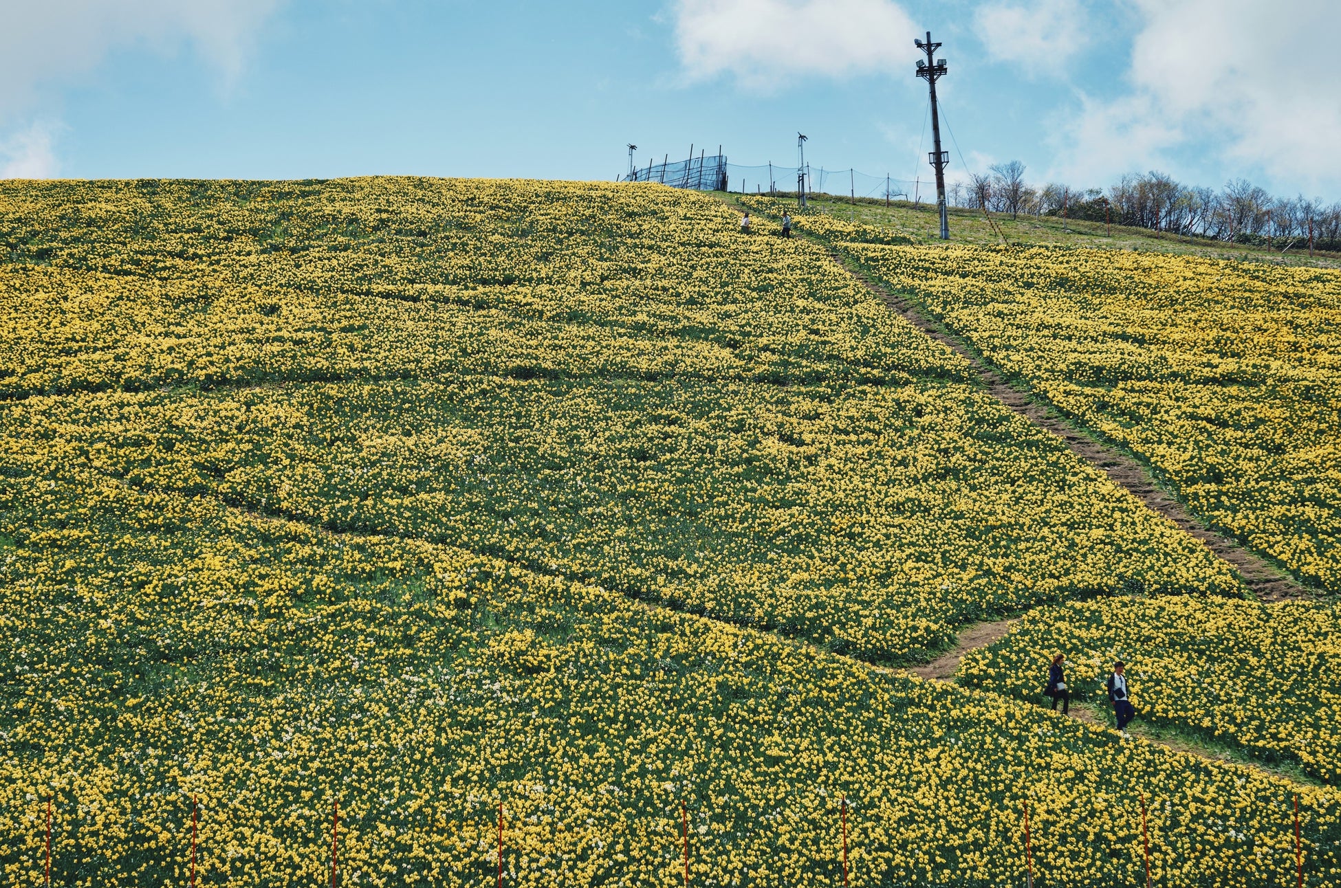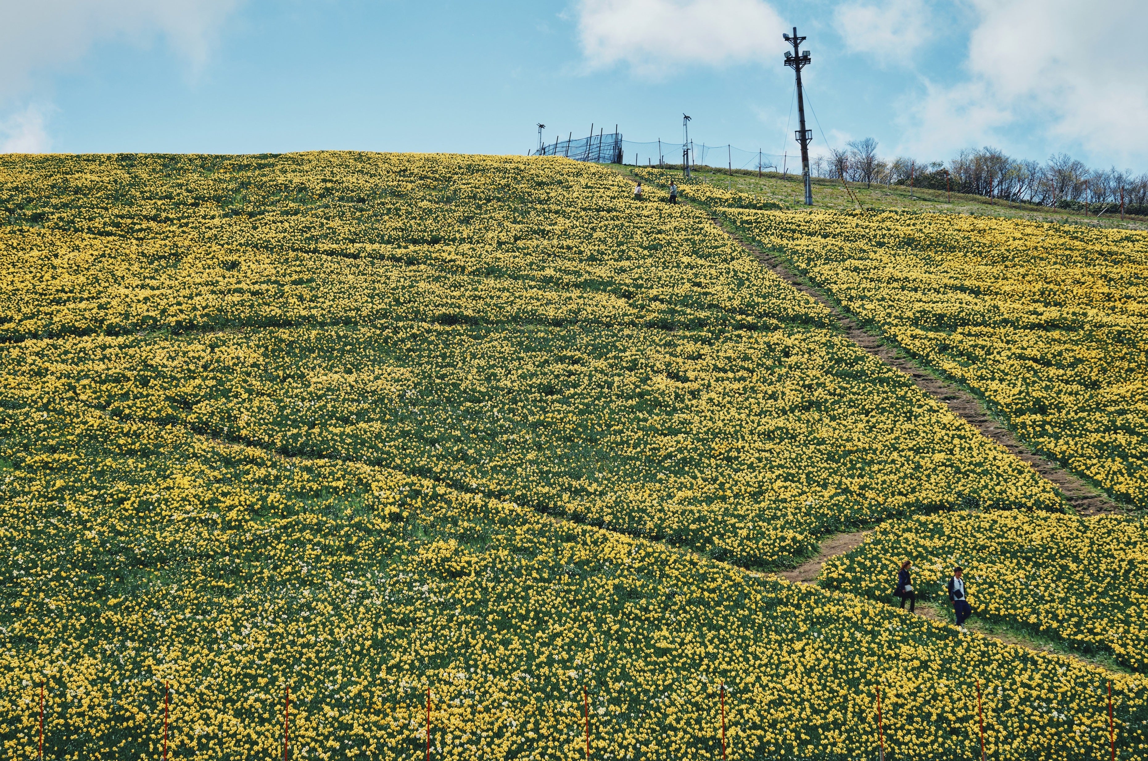 園内の蓬莱山の斜面、約2万㎡の広大な斜面に、約30万球・3品種の黄色い西洋スイセンが咲き広がり、冬季は一面の銀世界だった斜面は数か月で一転、この季節だけの絶景をお楽しみいただけます。