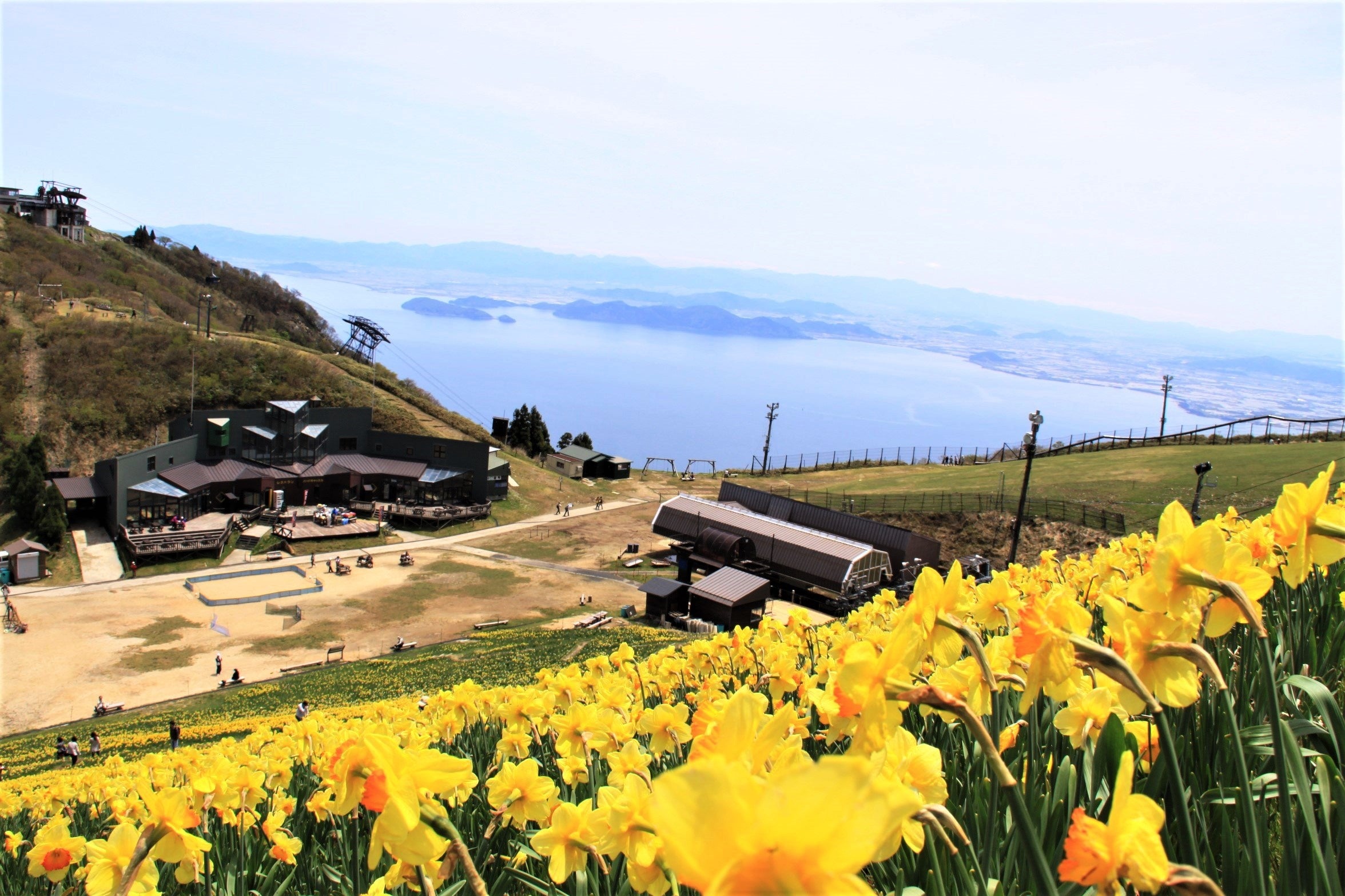 今年は暖かな気候により生育が進み、見ごろ間近のエリアも出始めています。4月最終週(今週)より見ごろに入り、ゴールデンウィークの5/3(土)~6(火・祝)頃にはピークを迎え、青い琵琶湖と初夏の青空、黄色いスイセンの色鮮やかなコントラストは圧巻です。また、観光リフトでアクセスができるのでお手軽にその絶景はお楽しみいただけます。