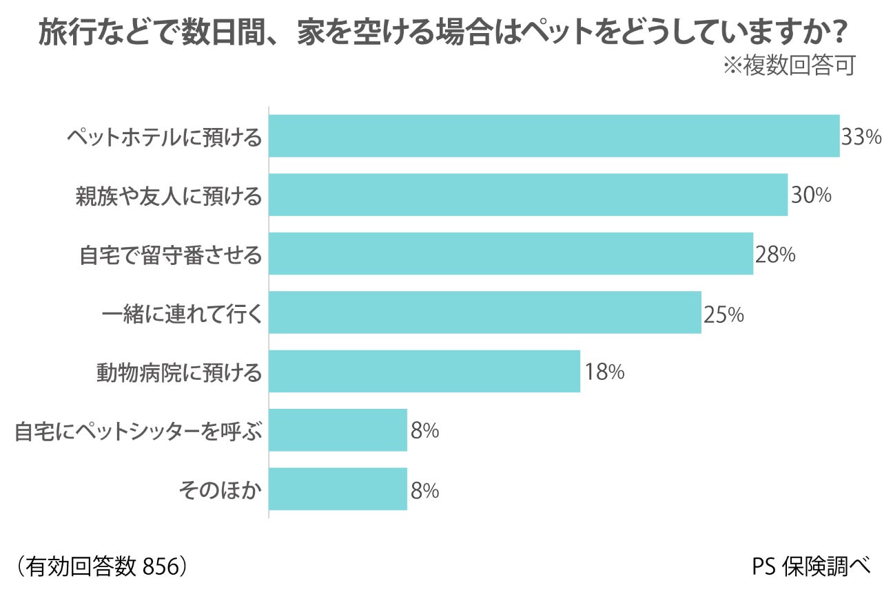 旅行などで数日間、家を空ける場合、飼い主はペットをどのように扱っているのでしょうか。アンケート結果によると、「ペットホテルに預ける」が最多の回答となり(33%)、次いで「親族や友人に預ける」(30%)が多く挙がっています。