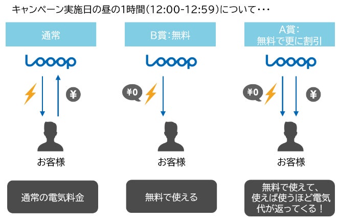 内容:事前エントリー&当選で、キャンペーン実施日の昼の1時間、「無料で使った分だけ更に割引」(A賞)または「無料」(B賞)で電気を使用できます。さらにアンケート回答で300円を電気料金から割り引きます。