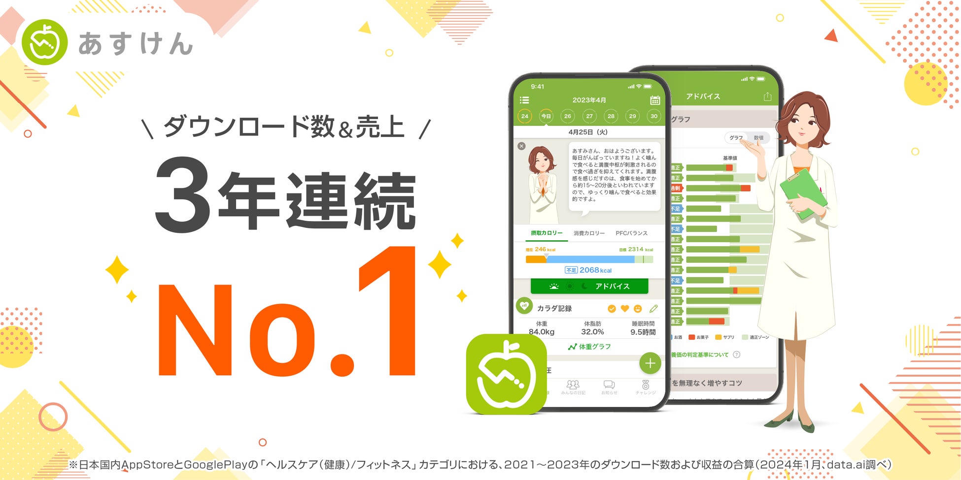 【3年連続No.1】AI食事管理アプリ『あすけん』2023年ヘルスケアアプリでダウンロード数&売上 国内1位を獲得