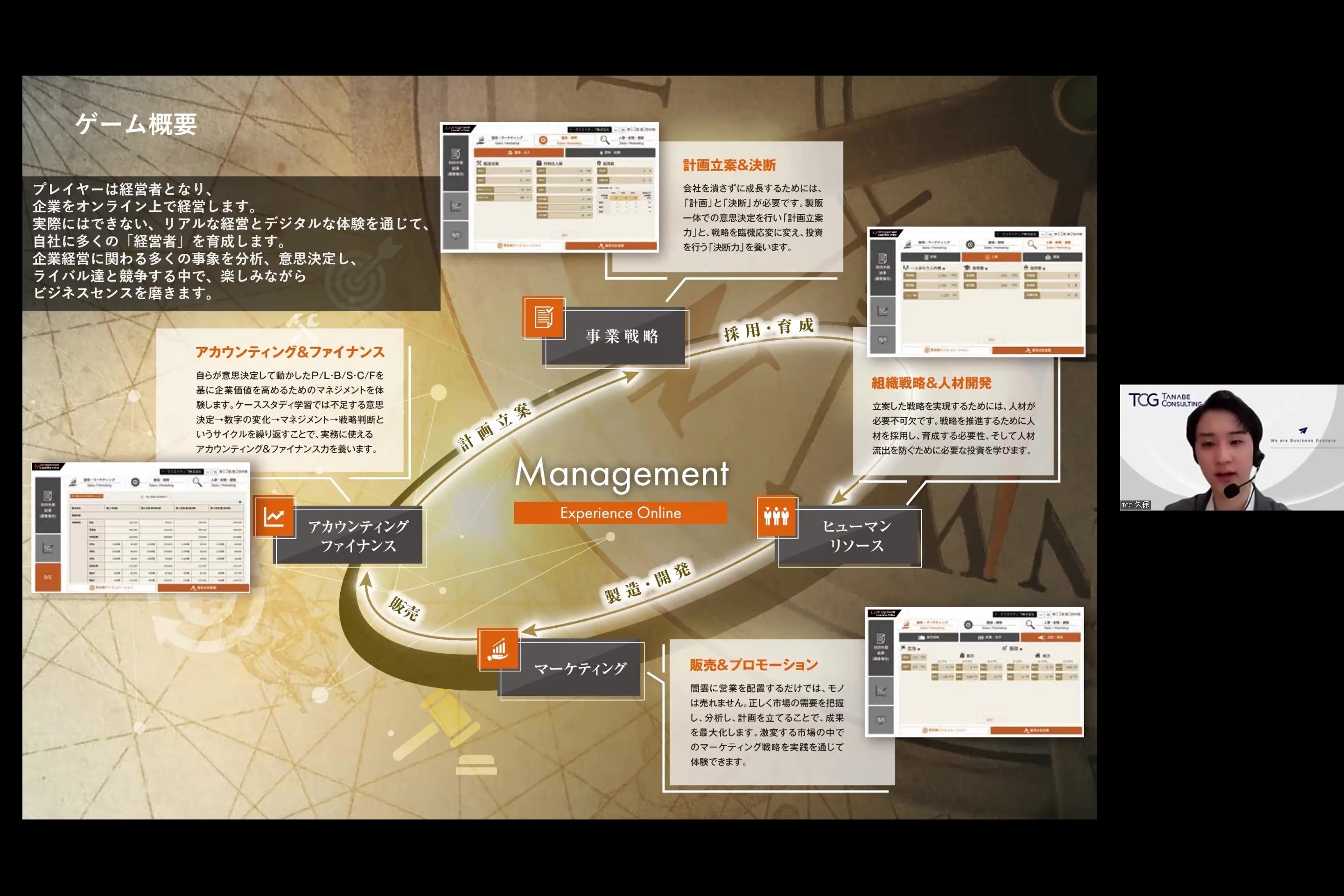 その後、3つのグループに分かれて、タナベコンサルティングが開発したビジネスシミュレーションゲーム「Management Experience Online」の体験会を実施。それぞれのグループでディスカッションを重ねながら、1ターン(四半期)ごとに経営に関する意思決定を行いました。社長役を担当した学生からは、「想像よりも考えることが多く、難しかったが、とてもやりがいが大きかった」「退職者が増えることを恐れて好待遇にしたことで想像以上に人件費が上がり、財務状況が悪化してしまった。座学では分からない経営の難しさについて身をもって痛感した」「大学では体験できない実践的なことを学ぶことができた」といった声があがりました。