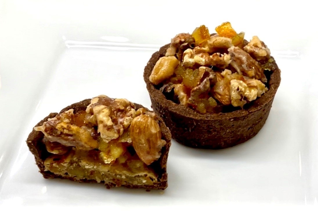 店頭での販売に適した商品であることなどの点から高い評価を得て、全6レシピの中から『キャラメルナッツタルト』が選ばれ、大丸梅田店での販売が決定しました。アーモンドやクルミなどのナッツの香ばしい味わいと、ビール粕由来のサクッとした食感、おから由来のしっとりした風味、キャラメルの程よい甘さが特長です。