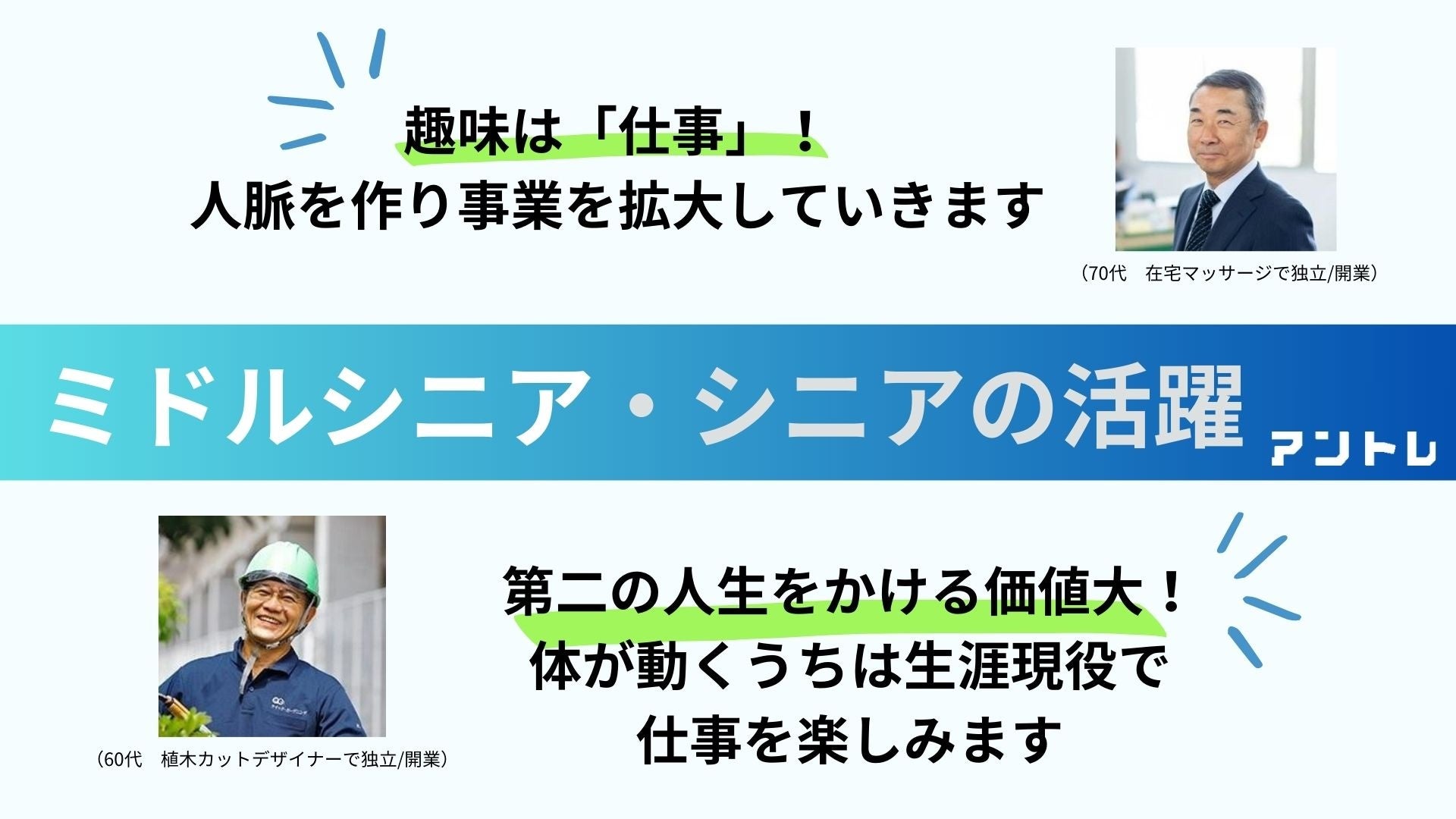 当社では、ミドルシニア・シニアの方の活躍を応援すべく、やりがいをもって独立した起業家のリアルな声や、社会貢献度の高いビジネスの魅力をお届けします。