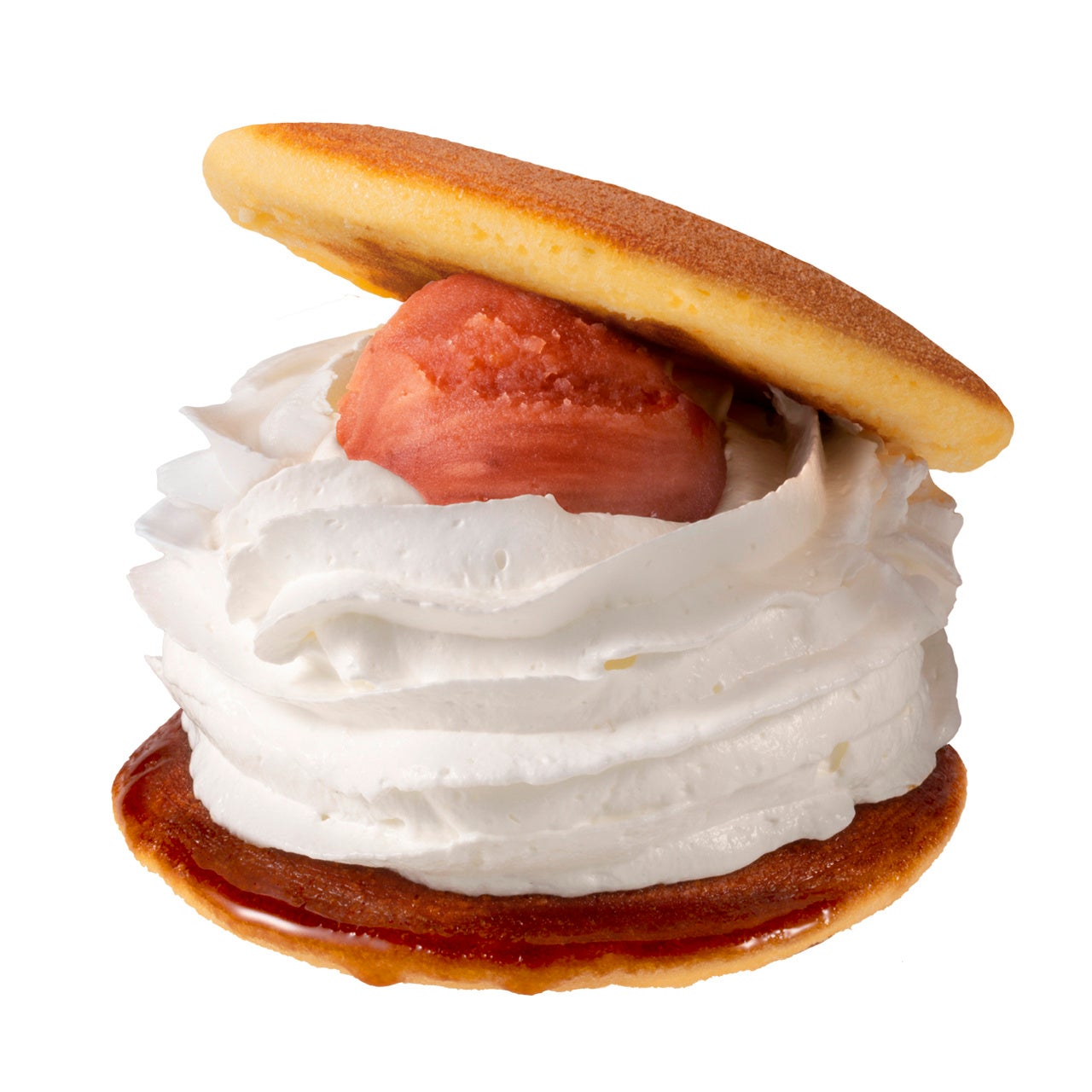 程よい甘さのどら焼き生地に、「榮太樓」こだわりのコク深い黒みつをたっぷりと染み込ませ、軽い口当たりのホイップクリームをサンドしました。苺を贅沢に使用した苺あんがフレッシュなアクセントになります。