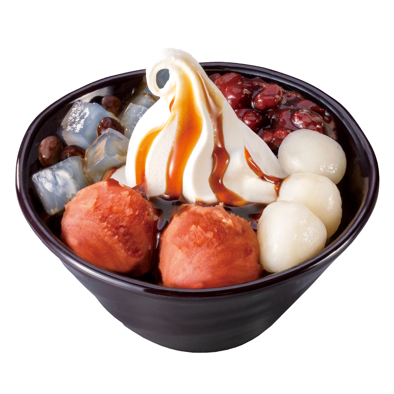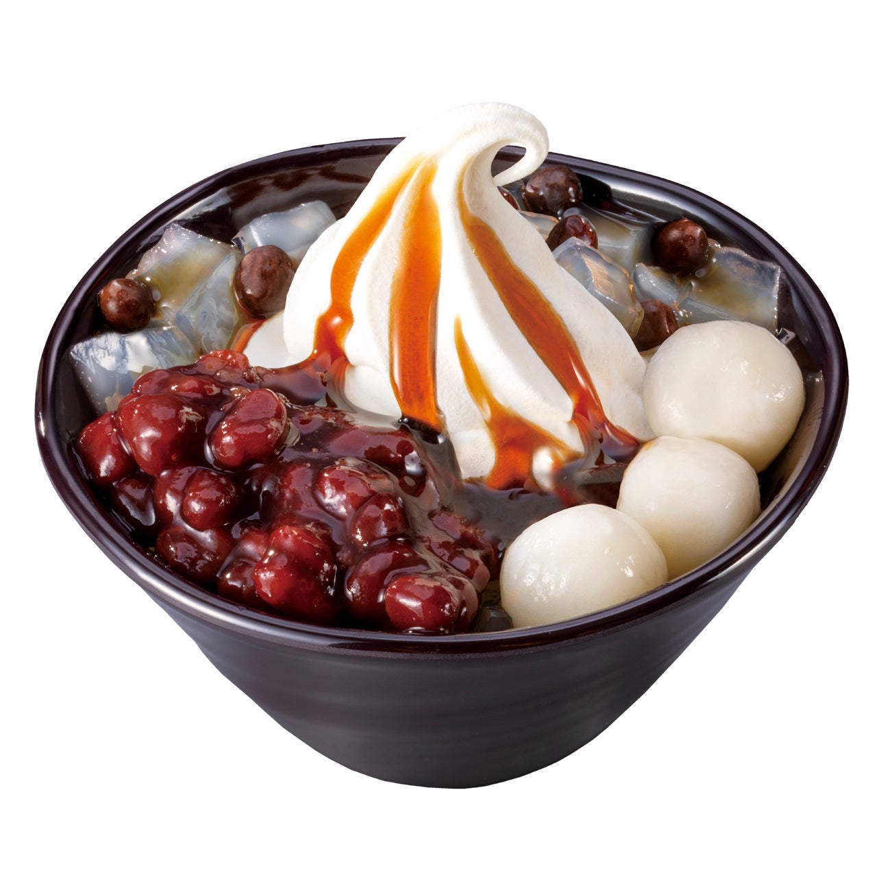 長年にわたり、愛されている白玉クリームぜんざいに寒天をトッピングし「榮太樓」こだわりのコク深い黒みつを合わせ、あんみつ風に仕立てました。北海道産ゆであずきはとろりと絡みのよいソース感に、あずきのしっかりとした食感も楽しめる粒立ちとなっています。さらに煮汁を活かした自然な風味とほどよい甘みが特徴で、スイーツの味わいに奥行きや余韻を与えます。
