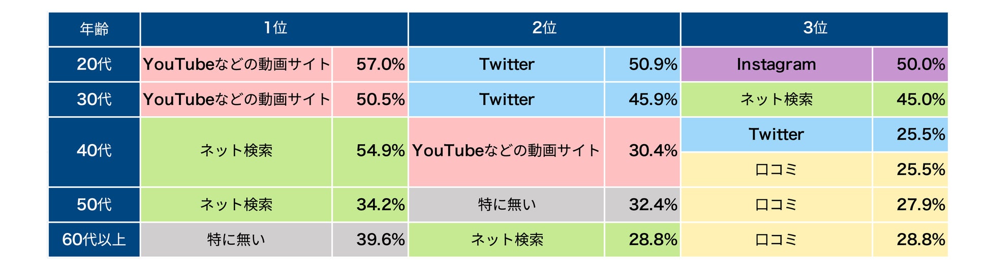 ②不動産売却に関する情報収集も20代、30代は「YouTubeなどの動画サイト」「Twitter」、「Instagram」が上位に。50代、60代以上は「特に無い」という理由が上位に登場。