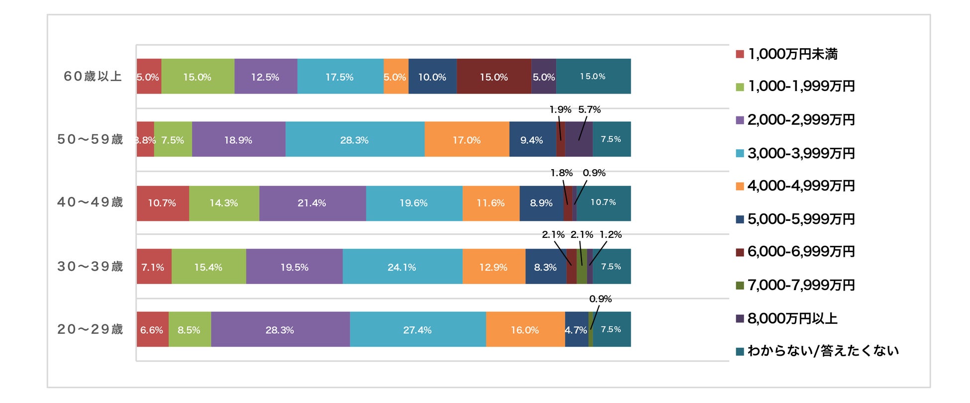 20代~50代では、4,000万円以内に約80%が集中している傾向があり、年代が高くなるに従って4,000万円以上の割合が増加する傾向にあります。60代以上になると、3,000万円台が17.5%と最も多いですが、1,000万円台と6,000万円台がそれぞれ15.0%となっており、金額が2極化する傾向が見て取れます。