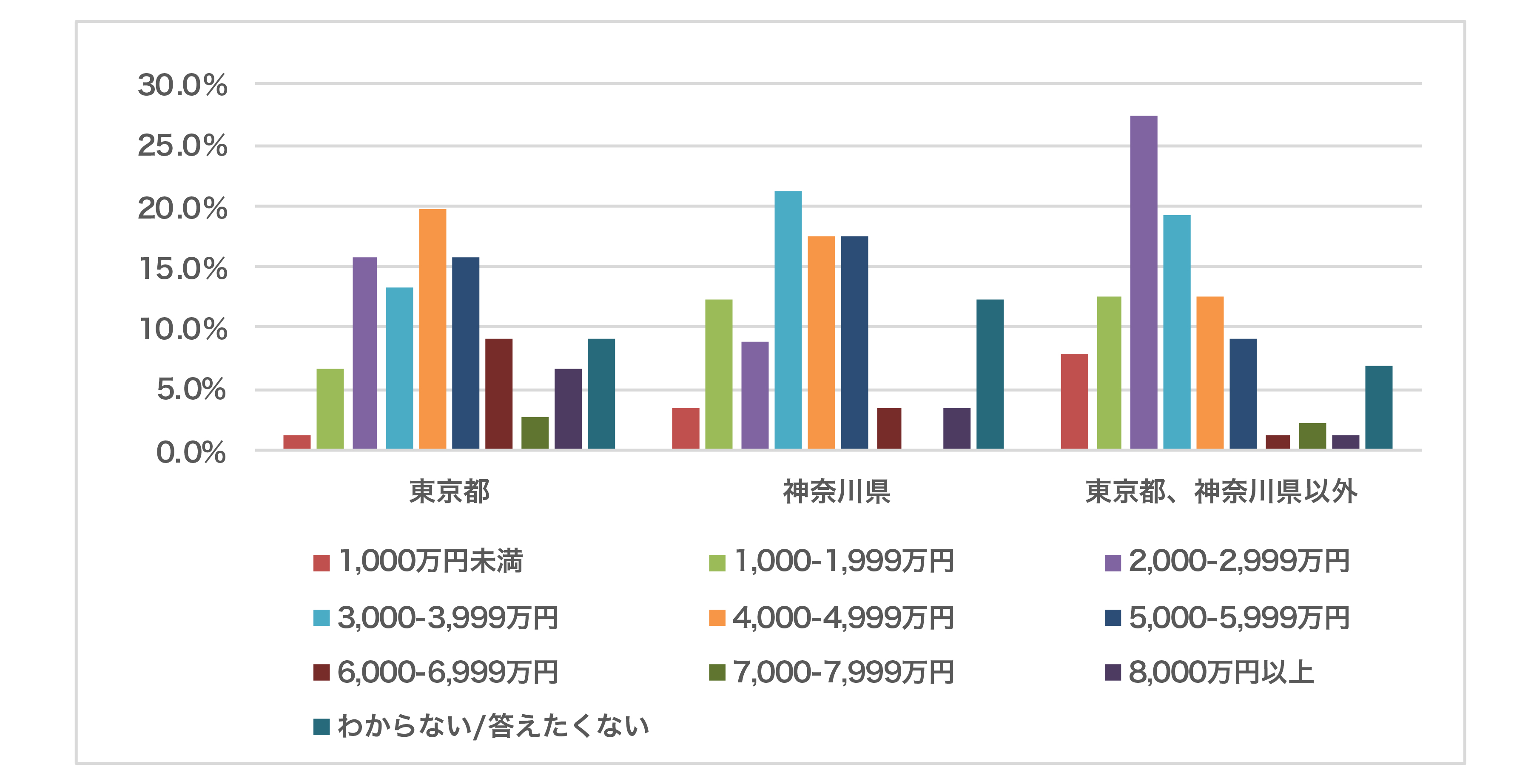 更に、関東に関して東京、神奈川とそれ以外のエリアでは市場規模が異なるので、見てみると東京、神奈川は凡そ3,000万円から5,000万円台がボリュームゾーンで6,000万円代以上と回答された方も他の県より多くなっており、物件によっては不動産購入金額が高額になっている状況が反映されています。
