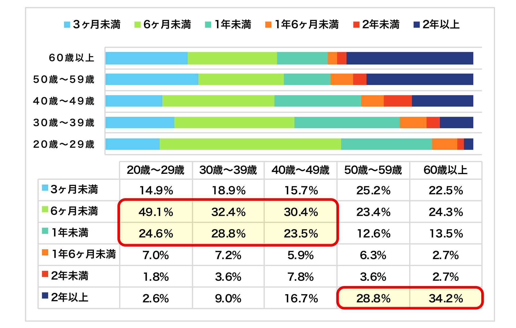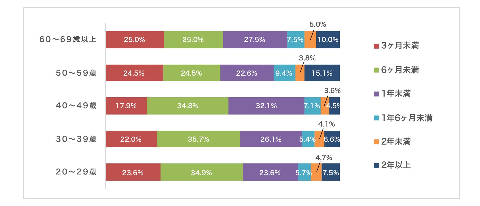 ②購入にかかった期間は、各年代「6ヶ月未満」が最多を記録。50代、60代は1年6ヶ月以上かかったという回答の割合が、他の年代より多くなっています。